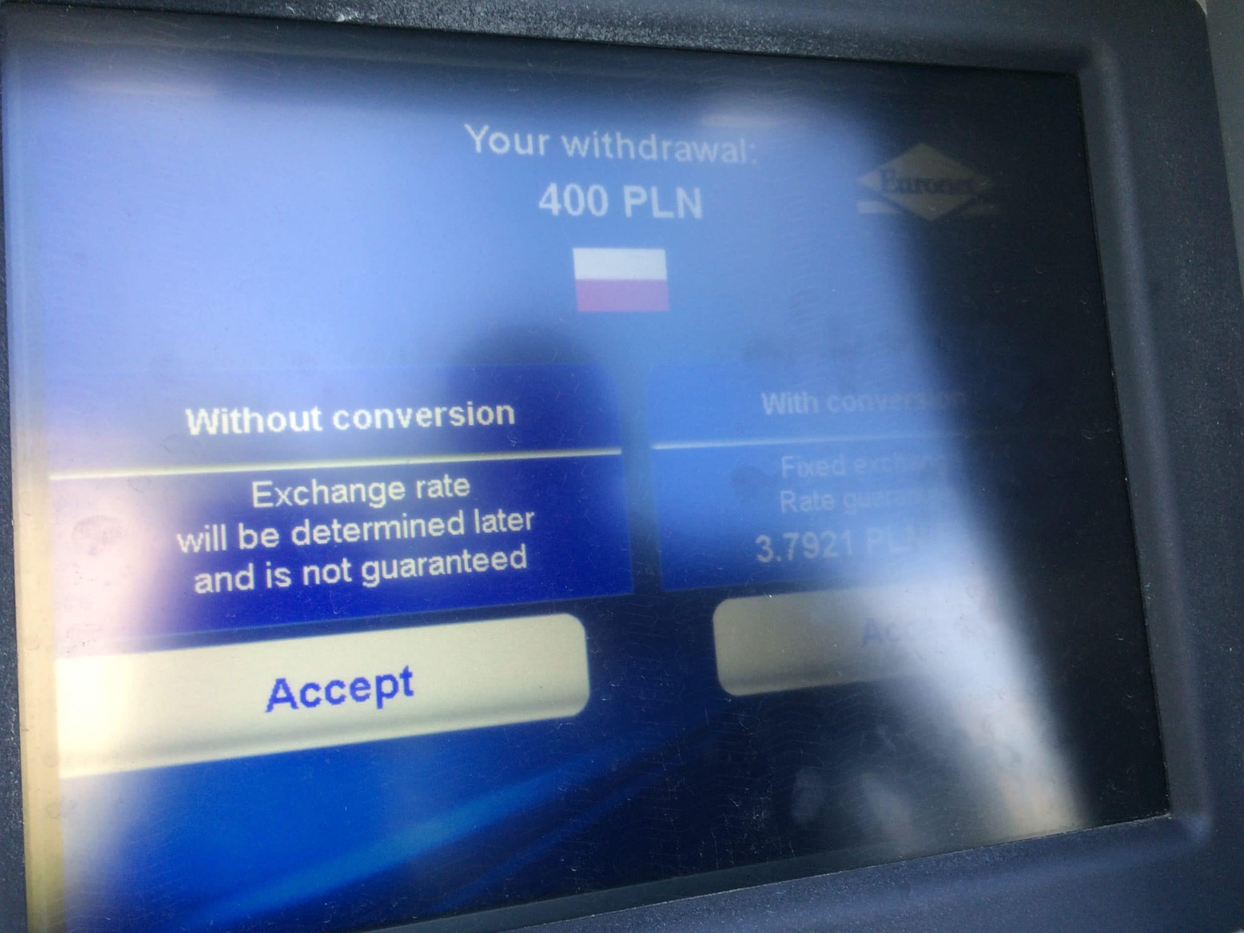 - Em toda a Polónia, ao levantar dinheiro, não deve aceitar a taxa de câmbio proposta (que é 3,79 em vez de 4,12). Escolha “Declinar conversão”