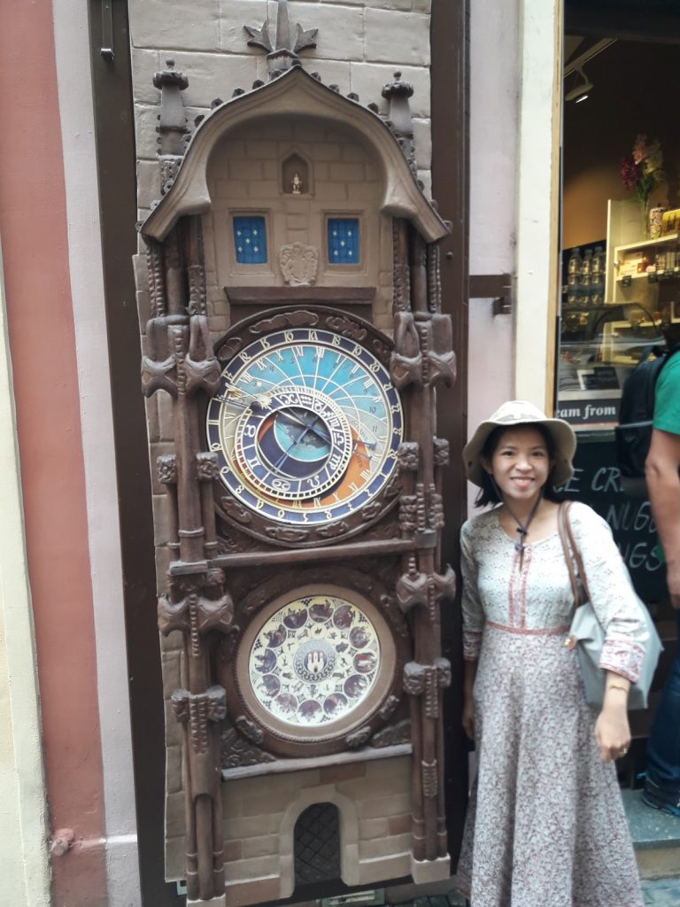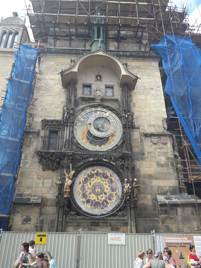 Está a formar-se uma multidão, as pessoas estão a ver alguma coisa. Então, como ovelhas, vamos ver o que elas estão a fazer. São 5:55, e em cinco minutos o relógio astronómico vai bater. Às 18h em ponto, os autómatos começam a mover-se, o esqueleto à direita toca um pequeno sino, vemos os santos a marchar, tudo isto dura menos de um minuto. É muito engraçado.