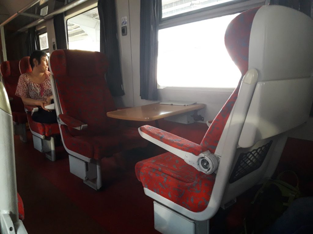 Mal temos tempo para comprar sanduíches no metro quando o nosso comboio já está a chegar. Estamos no carro errado, mas os controladores são muito simpáticos e mostram-nos o carro certo. Tive a 1ª classe por nós, felizmente fi-lo porque o JB teria ficado muito apertado na 2ª classe. Como sempre, em todo o mundo, JB cai sobre um quadrado de 4 (farejar), ele odeia porque não é ideal para suas pernas longas