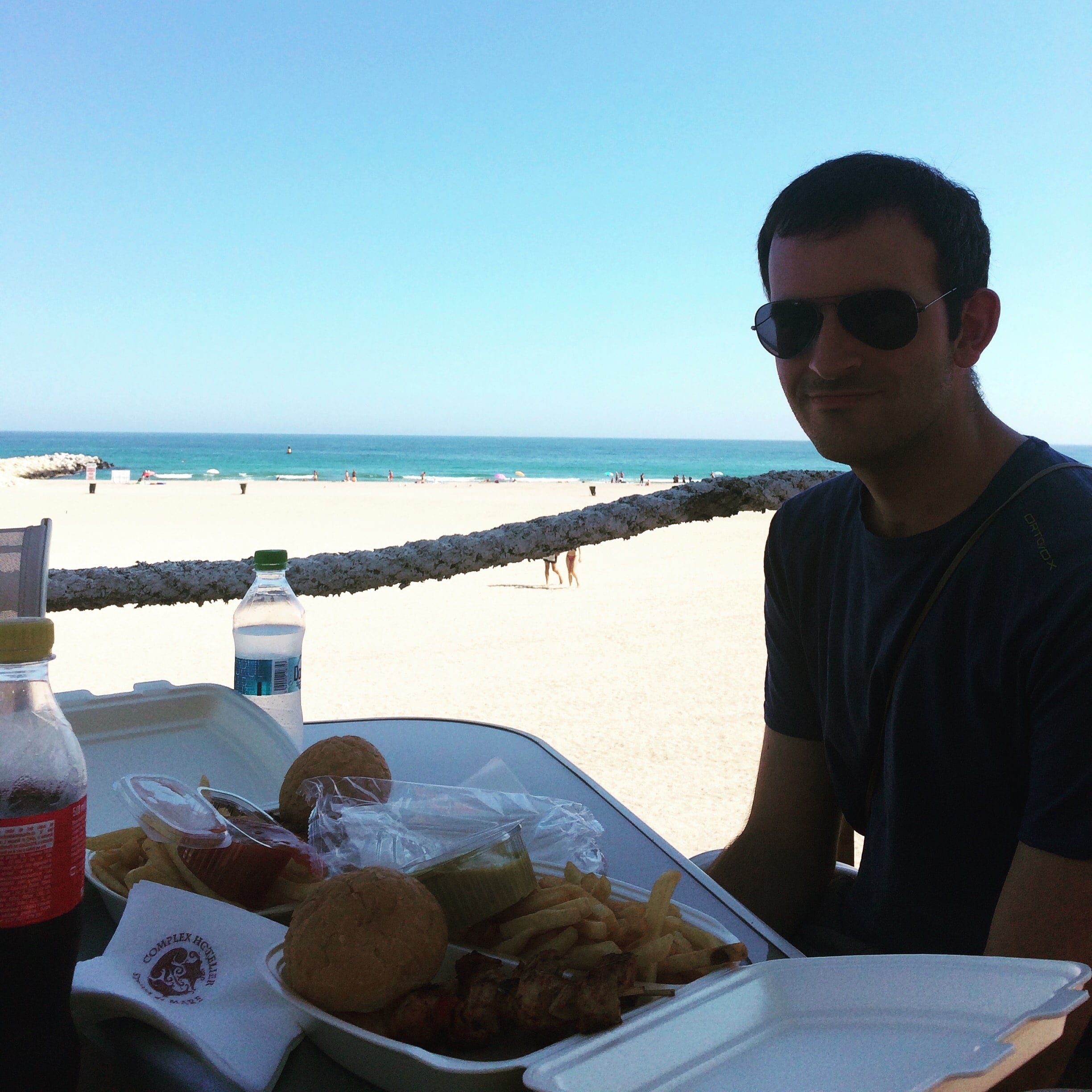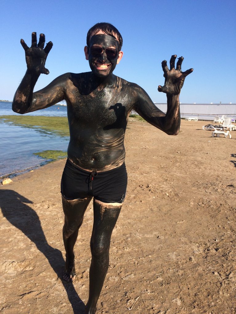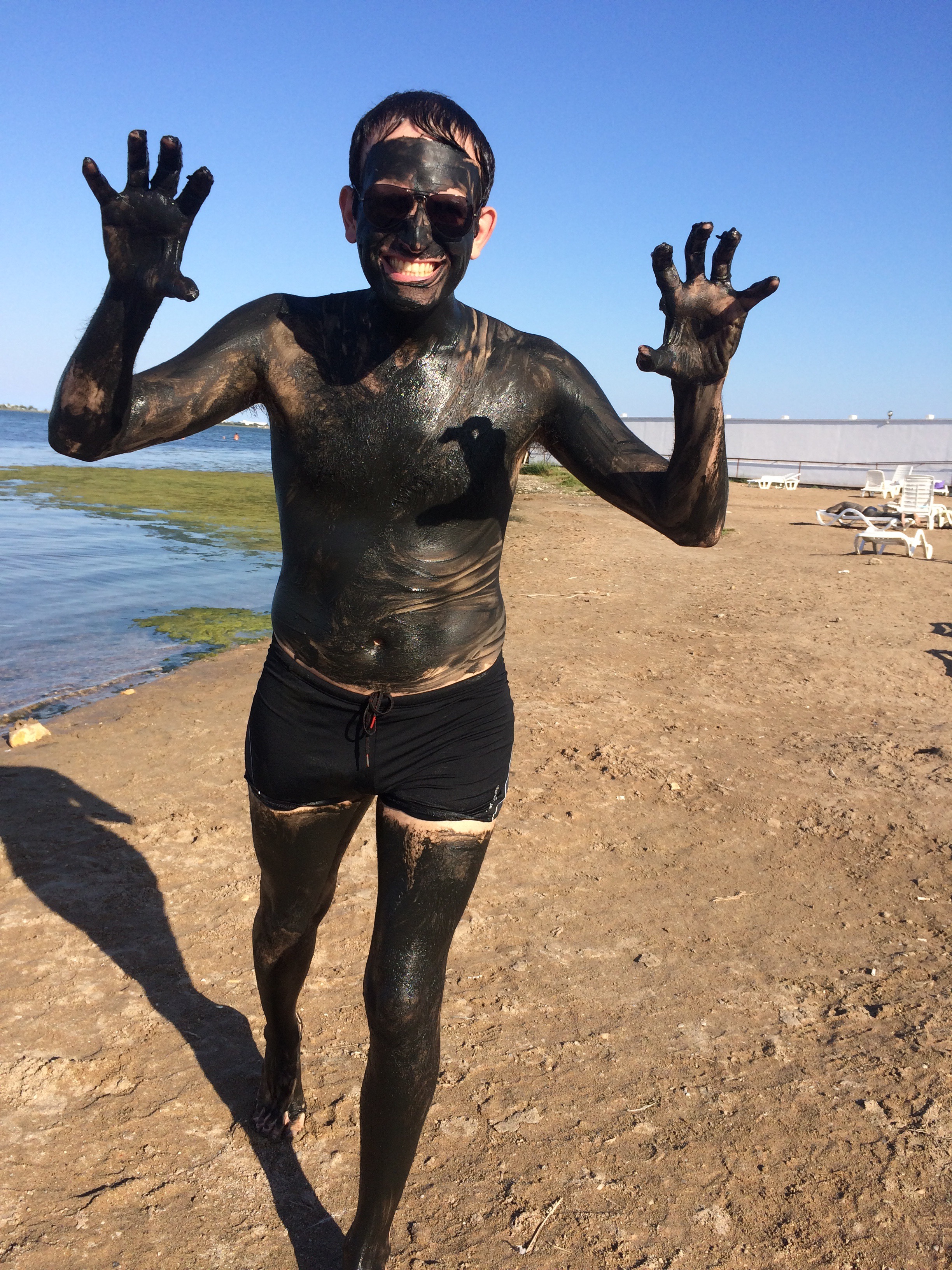Nós seguimos as instruções religiosamente. J.B. põe lama por todo o corpo dele. Ela cheira um pouco mal, por isso só pus um pouco na minha cara para… Os outros clientes também estão cobertos de lama, e secam ao sol, em pé. De vez em quando, vemos casais idosos, cobertos de lama, de mãos dadas, caminhando em direção ao lago e ajudando um ao outro a se livrar da lama. A lama sai muito rapidamente e não deixa uma marca nos fatos de banho