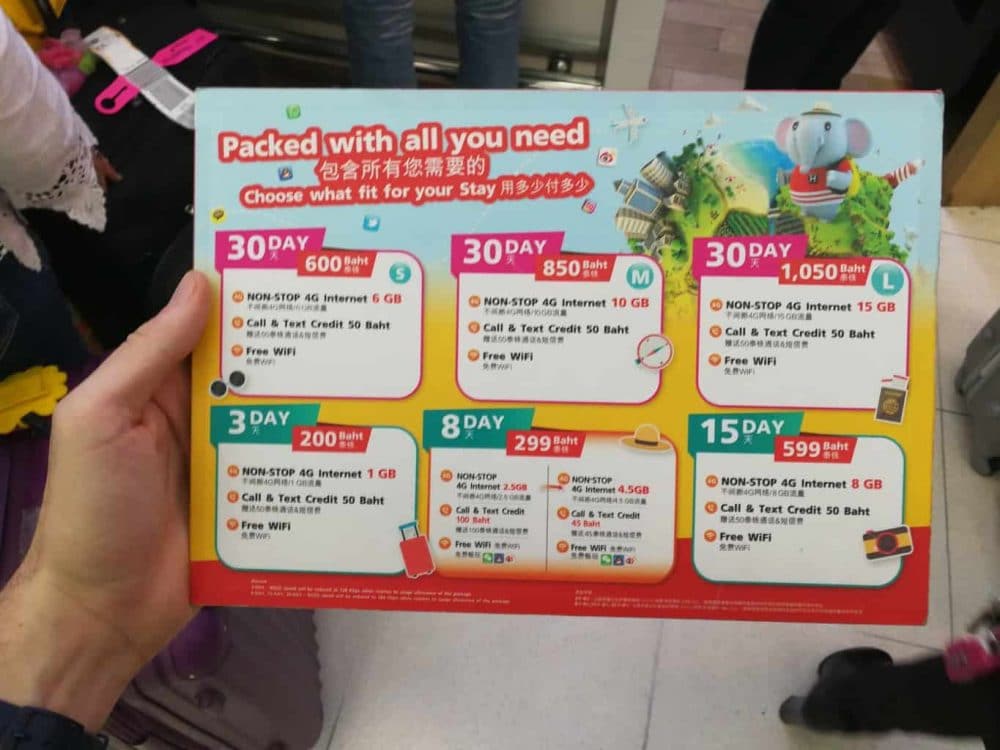 As taxas variam de 200 baht por 3 dias e 1 GB de dados a 1050 baht por 30 dias e 15 GB de dados.
