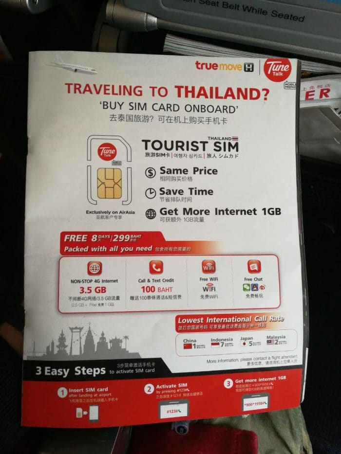 Estes preços são para turistas. Se você puder esperar um pouco, você pagará menos comprando seu cartão mais tarde em uma loja TrueMove. Em Chiang Mai, pagamos 300 baht por 2,5 GB de dados durante 30 dias.