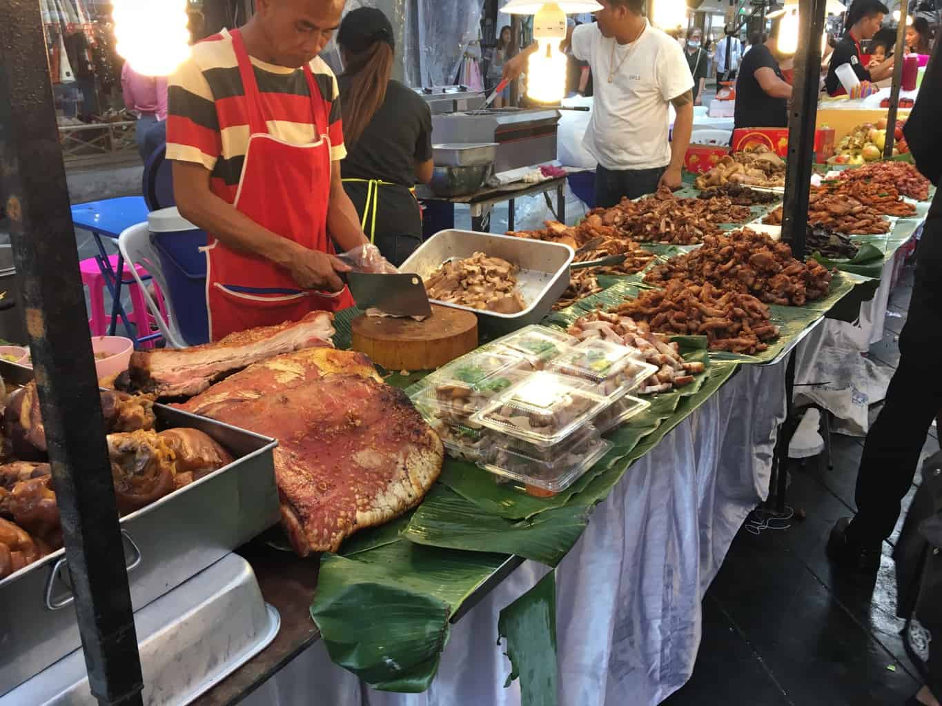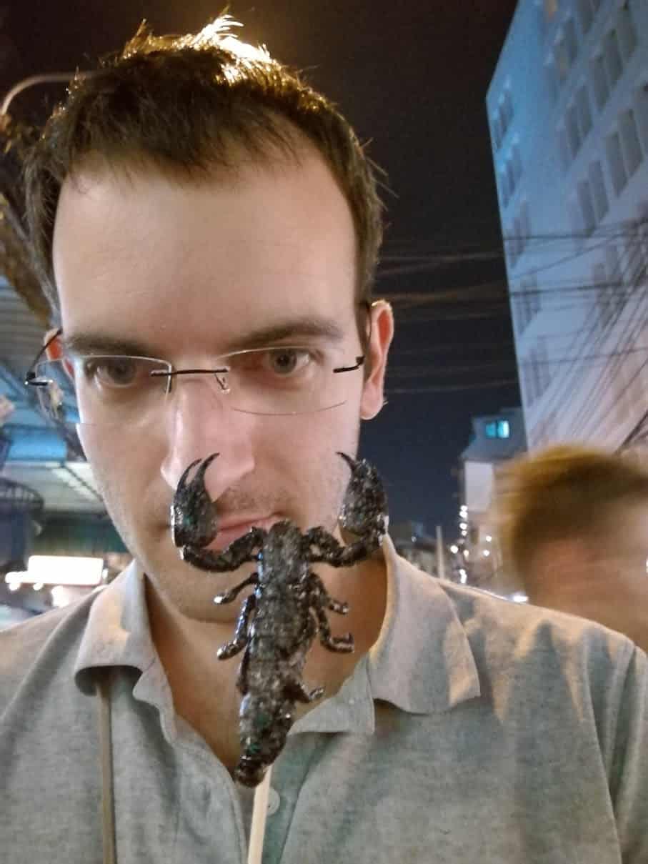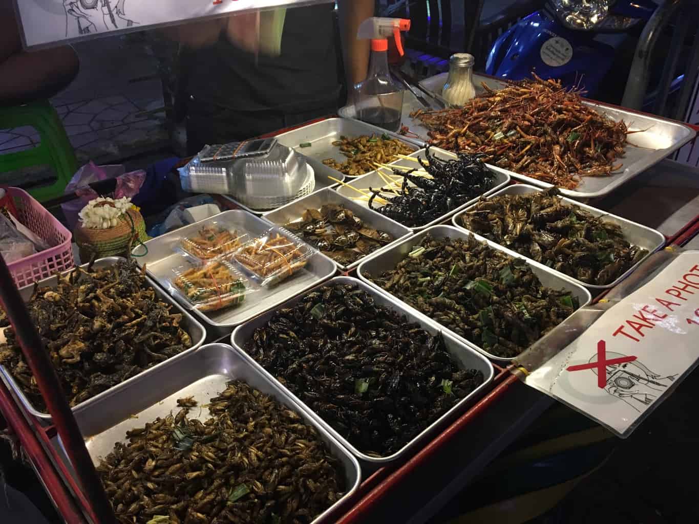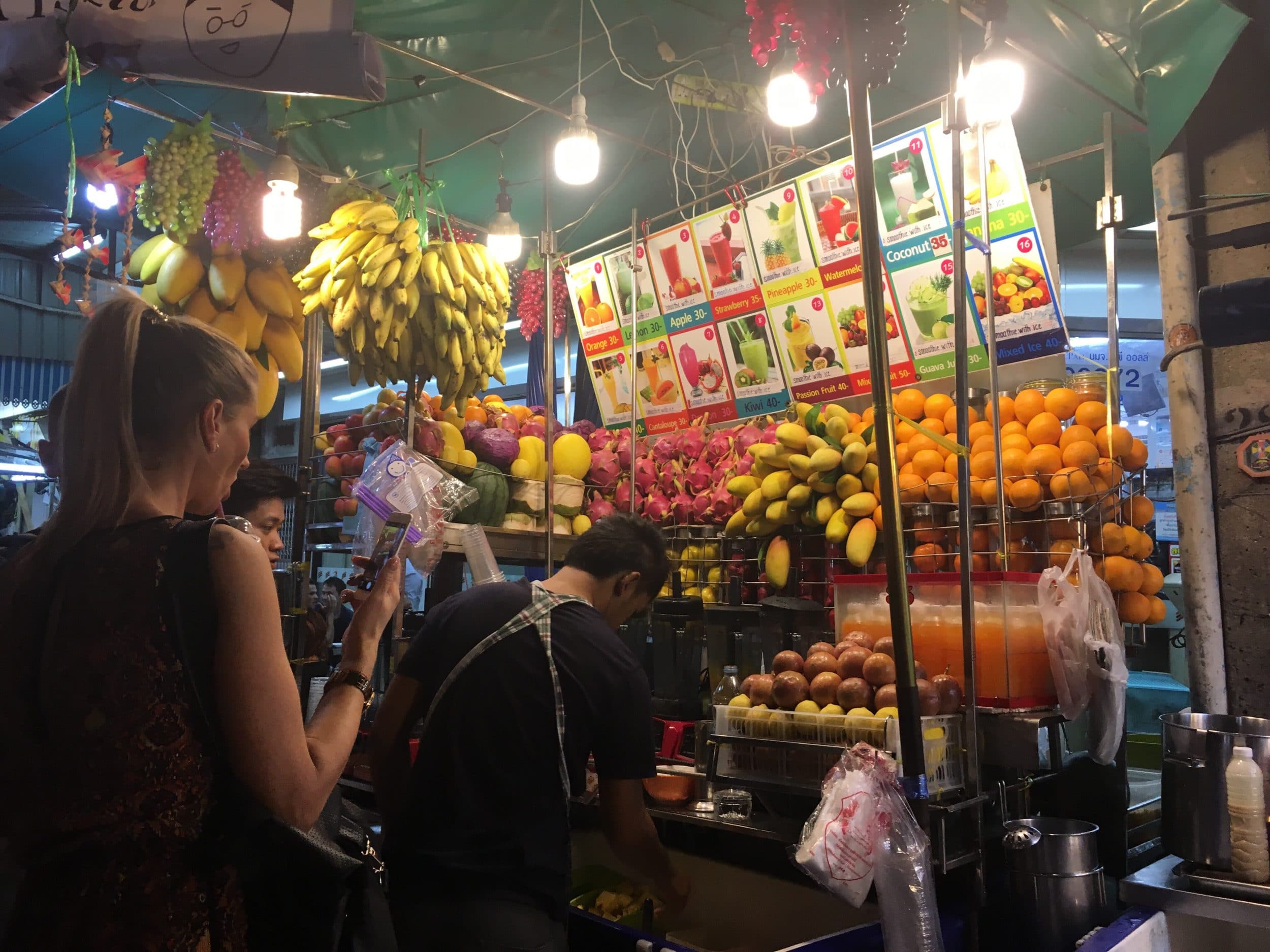 Devo dizer que estou bastante decepcionado com este mercado que sempre propõe os mesmos pratos (pad thai, kebabs e sucos de frutas). Os preços não são muito interessantes em comparação com o mercado visto à tarde. Jb foi capaz de provar um escorpião a preço turístico (100 baht em vez de 30 baht); mas os outros pratos são todos amigáveis ao turista.