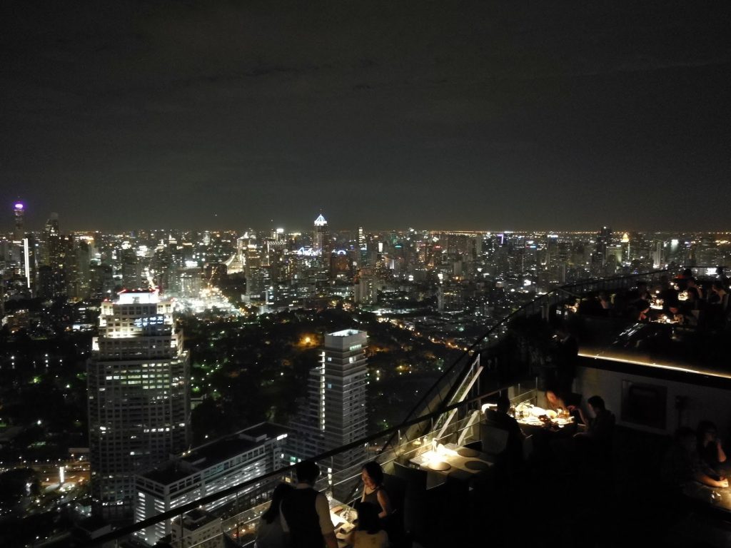 Terminamos a noite com uma bebida no telhado do Banyan Tree, um hotel de 5 estrelas. É tão luxuoso que qualquer convidado que venha com calções e sandálias é emprestado calças e sapatos fechados (esta regra só se aplica aos homens). Os cocktails custam cerca de $15, e para o jantar tem de encomendar um prato que custa no mínimo $50. O serviço é médio, mas ei, você tem que visitar pelo menos um telhado em Bangkok