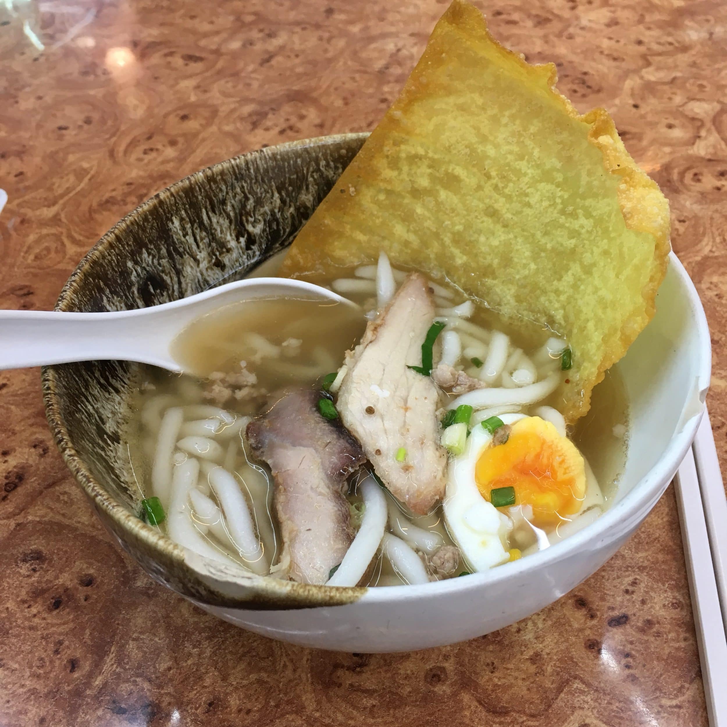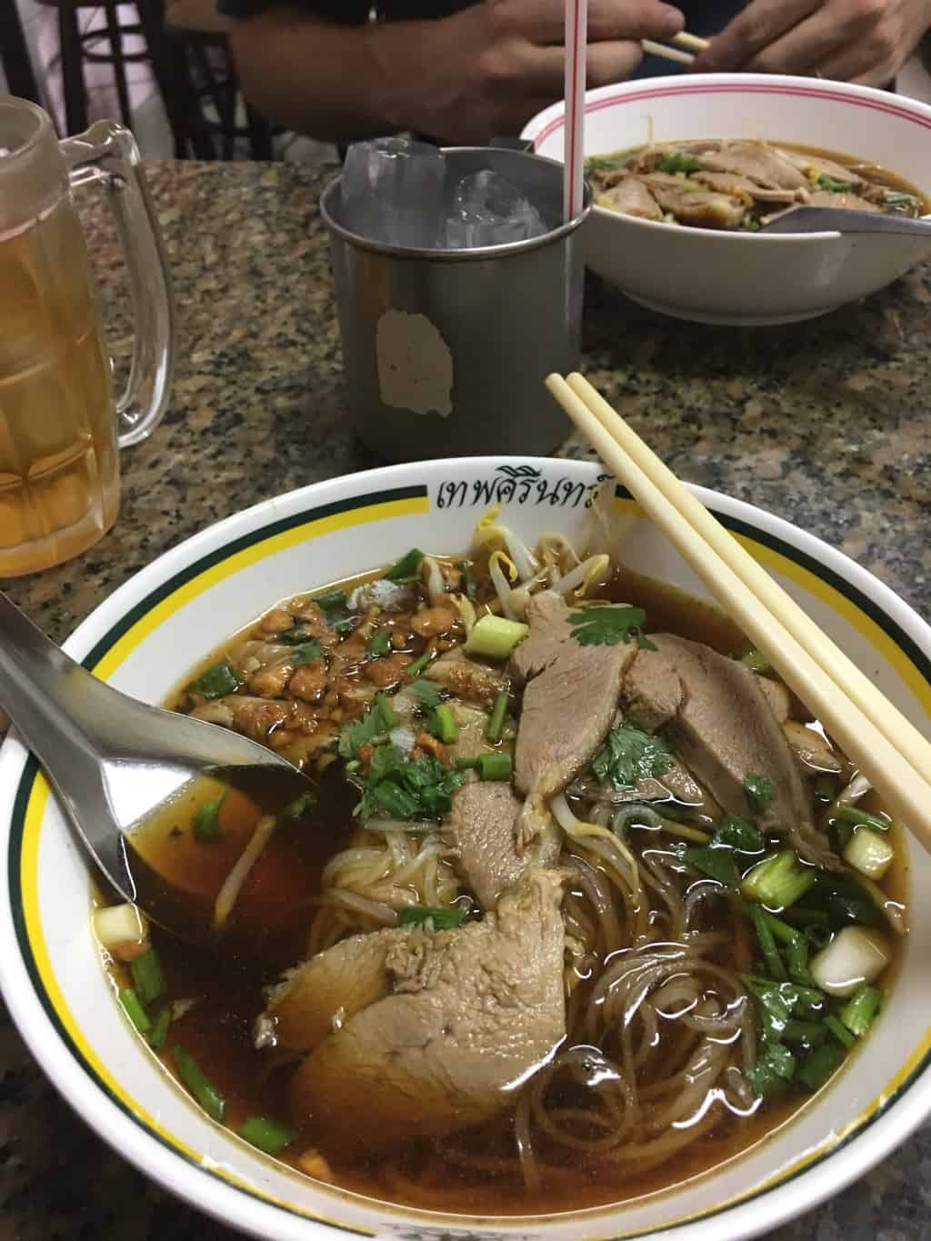 Tão cedo as coisas deixadas no hotel (e as coisas de valor escondidas), saímos para comer. Descobrimos com alegria a proximidade do nosso hotel com uma escola (que diz que a escola diz comida de rua barata para as crianças). Nós optamos por um bui bui especializado em sopas de pato/boi. 150 bahts para dois, nada mal para uma primeira refeição.