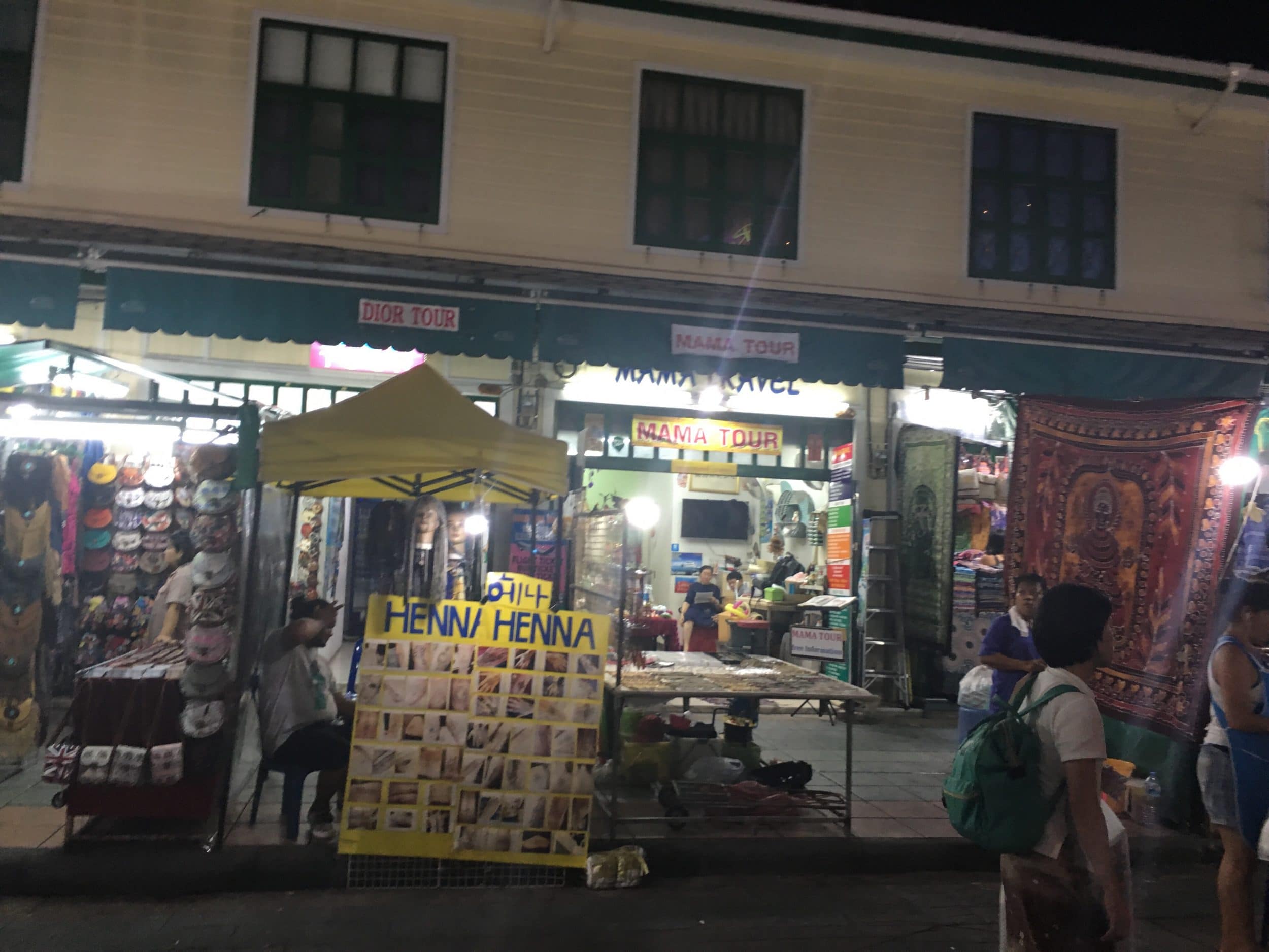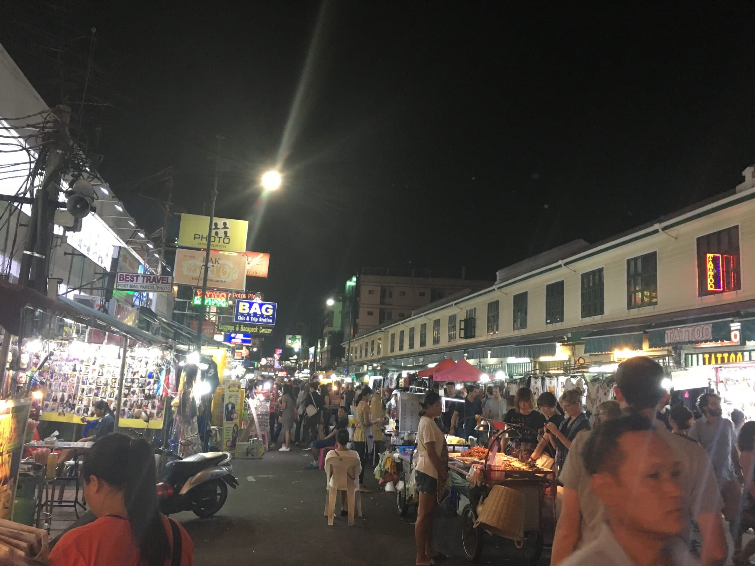À noite, decidimos ir ao mercado noturno de Khao San (um endereço bem compartilhado entre os mochileiros). Nós exploramos a rua Khao San e a rua paralela a ela.