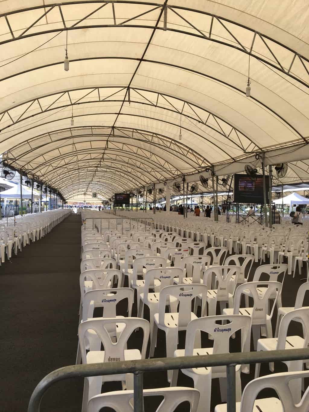 Estou a fazer bluff com a organização tailandesa. A entrada é dividida em duas (estrangeira/thai). Os estrangeiros devem dar o seu nome próprio e nacionalidade. Depois atravessamos um longo caminho onde várias pessoas nos dão coisas: panfleto, bolos, água, guarda-chuva, crachá.
