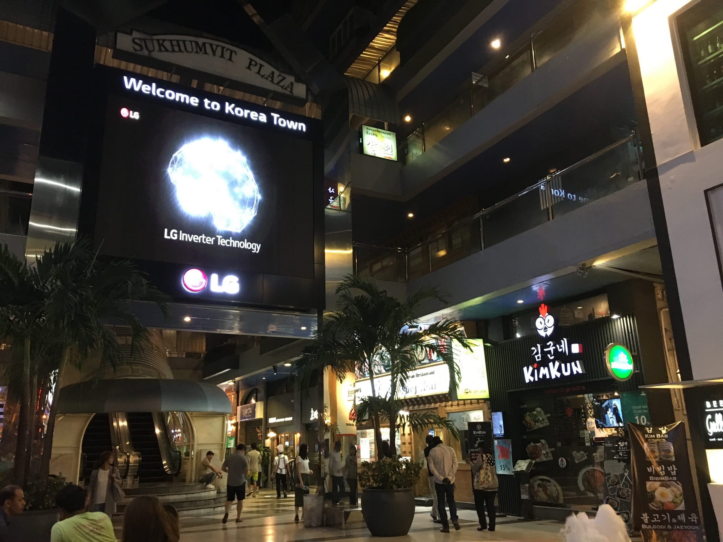 À noite, vamos para a praça Korean Town, onde há vários restaurantes coreanos.