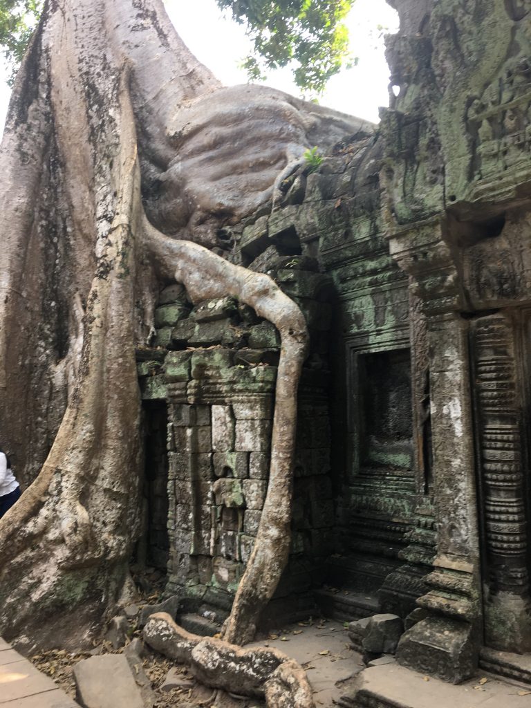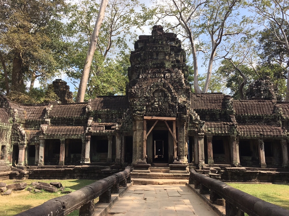 O Ta Prohm é um dos templos mais conhecidos graças às suas paredes aprisionadas ou destruídas pelas raízes de árvores centenárias – e ao seu aparecimento no filme Tomb Raider