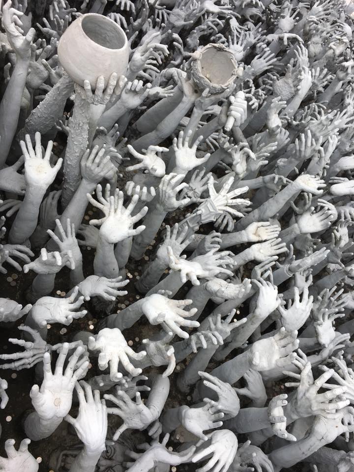 No lado esquerdo do templo, há uma piscina onde nadam grandes peixes brancos! Depois atravessamos uma ponte falsa, onde passamos por cima de centenas de esculturas de mão.