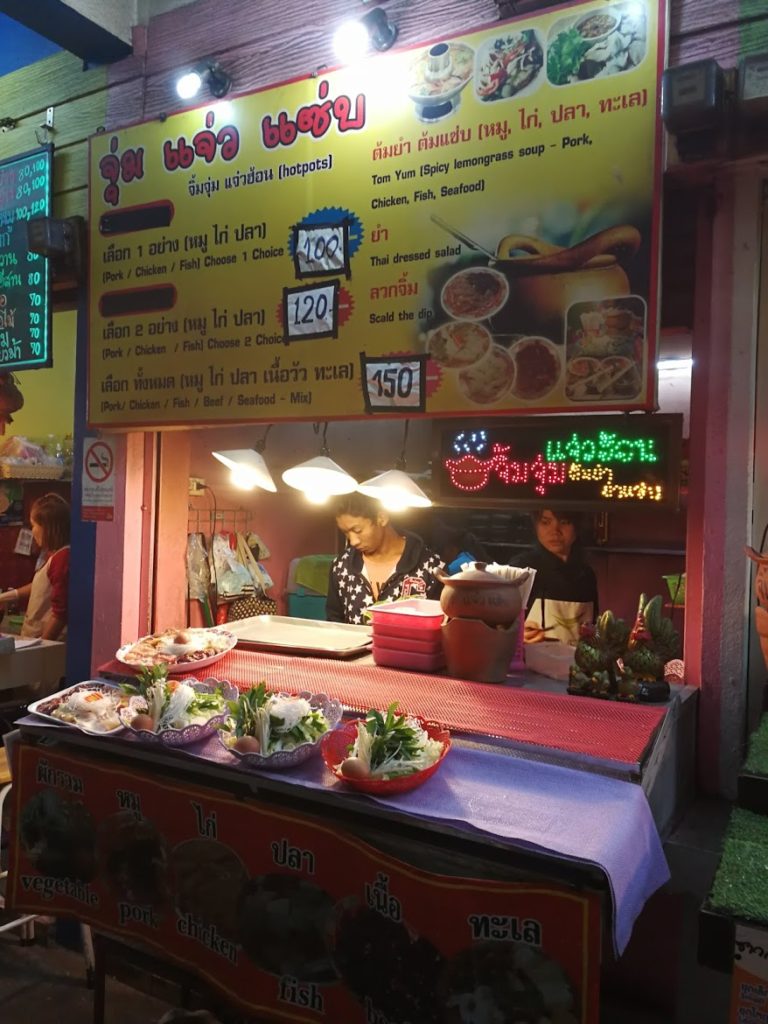 Depois voltamos para o hotel antes de sairmos novamente às 19h para o Night Bazaar. O tuk tuk do hotel nos leva lá de graça, mas voltamos bem rápido porque este mercado é muito menos interessante do que o de Chiang Mai. A única coisa interessante, é este tipo de restaurantes que propõem mini panelas quentes (fondues) em serviços de terracota.