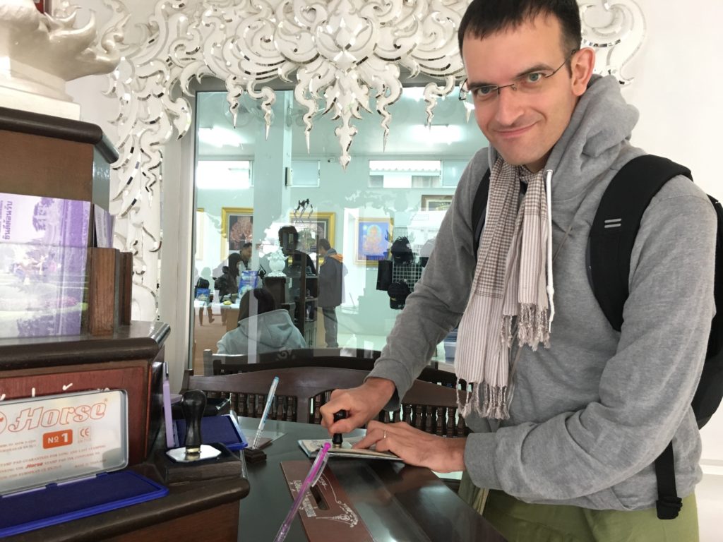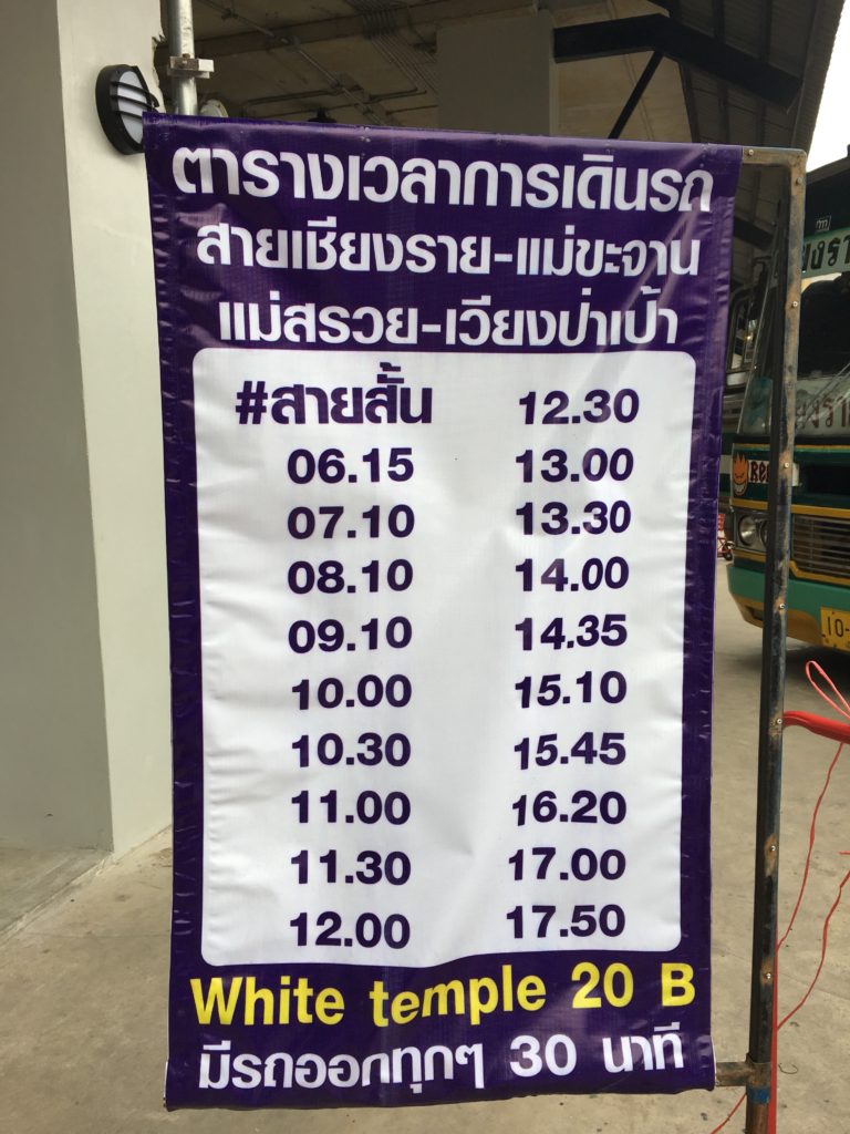 A viagem de 3 horas é bastante agradável, eles até nos dão água. Há demasiadas voltas durante a última hora. Como cada um de nós tem apenas uma pequena mochila, pedimos ao motorista para nos deixar no Templo Branco, que fica a 14 km da cidade de Chiang Rai.