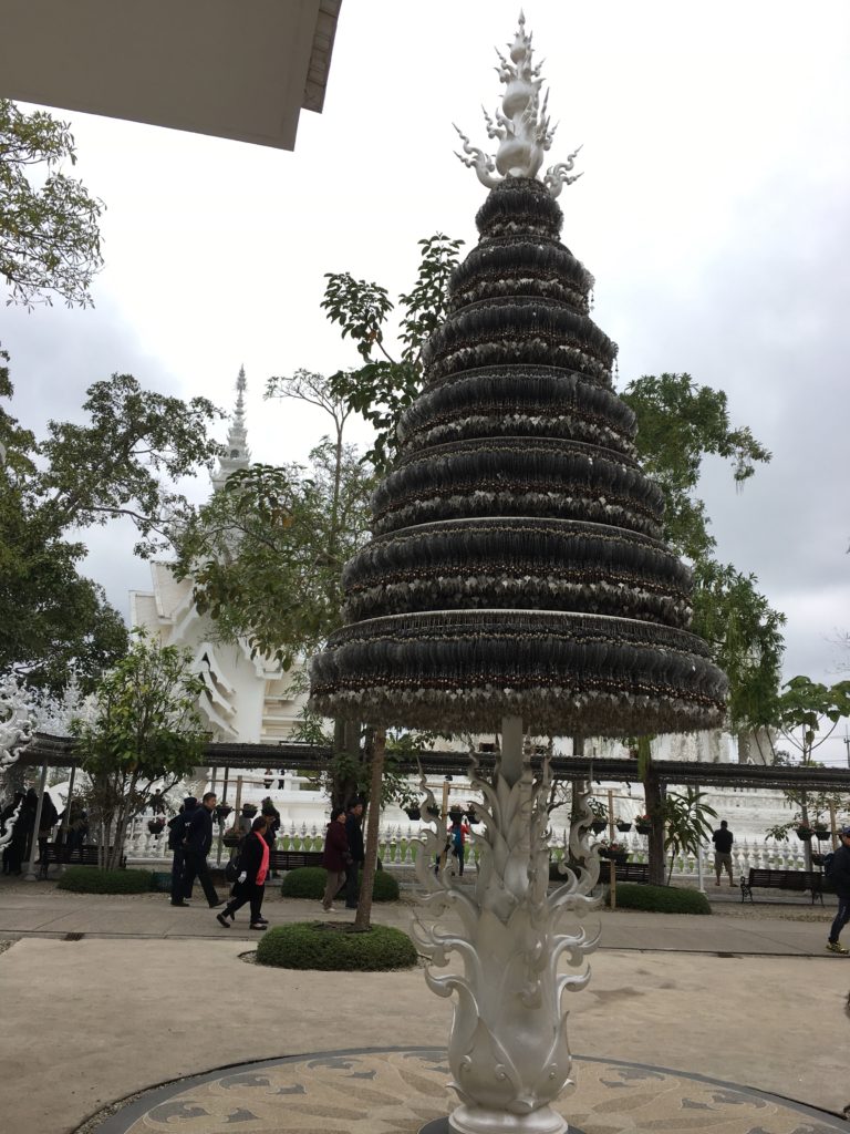 A primeira coisa que nos impressiona é o quão branco é este templo. Branco, branco, branco! Apesar do céu nublado, ficamos deslumbrados com a brancura deste templo e especialmente com os muitos pequenos espelhos que estão colados às decorações de gesso.