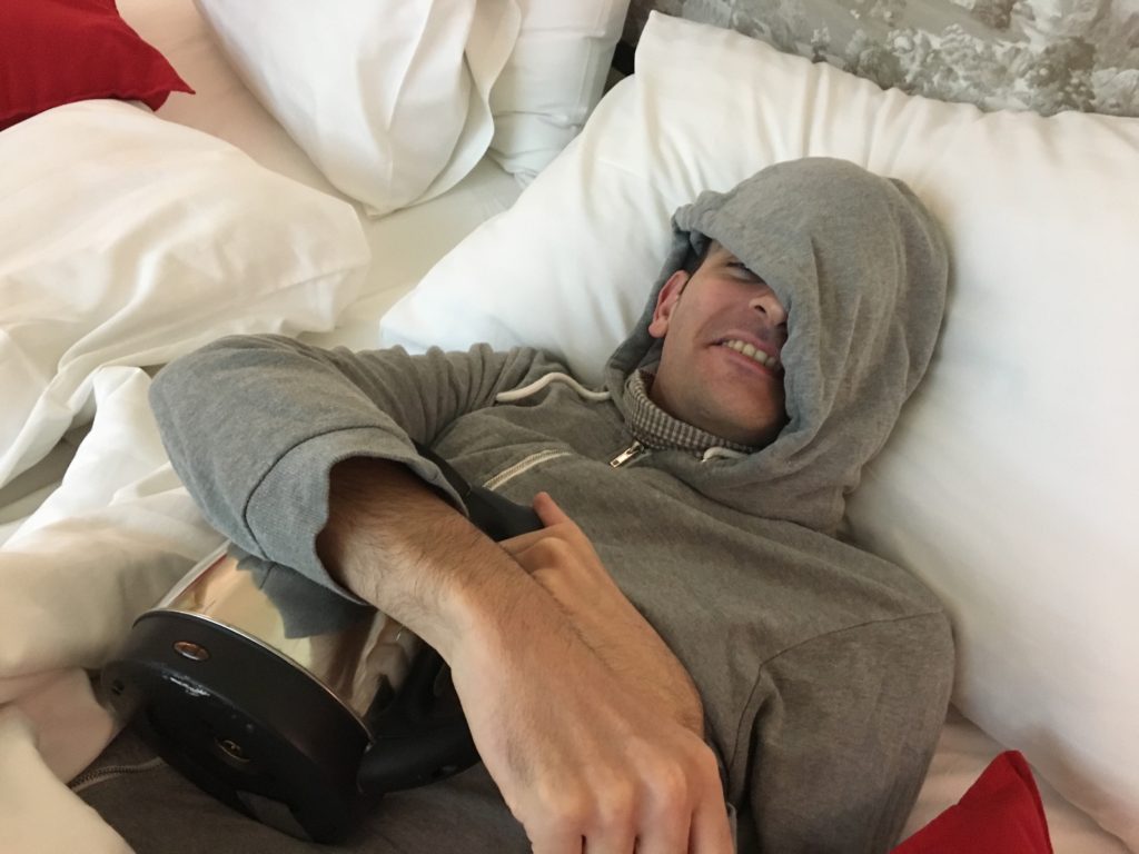 Como resultado, JB ficou doente muito rapidamente depois de visitar o templo. Culpado pelos meus maus conselhos, e como o quarto do hotel não tem aquecimento, procurei uma maneira alternativa de aquecer JB o mais rápido possível: uma chaleira (depois de ter esvaziado a água quente de qualquer maneira)! Então foi com esta chaleira que JB tirou uma soneca e milagre, é realmente melhor!