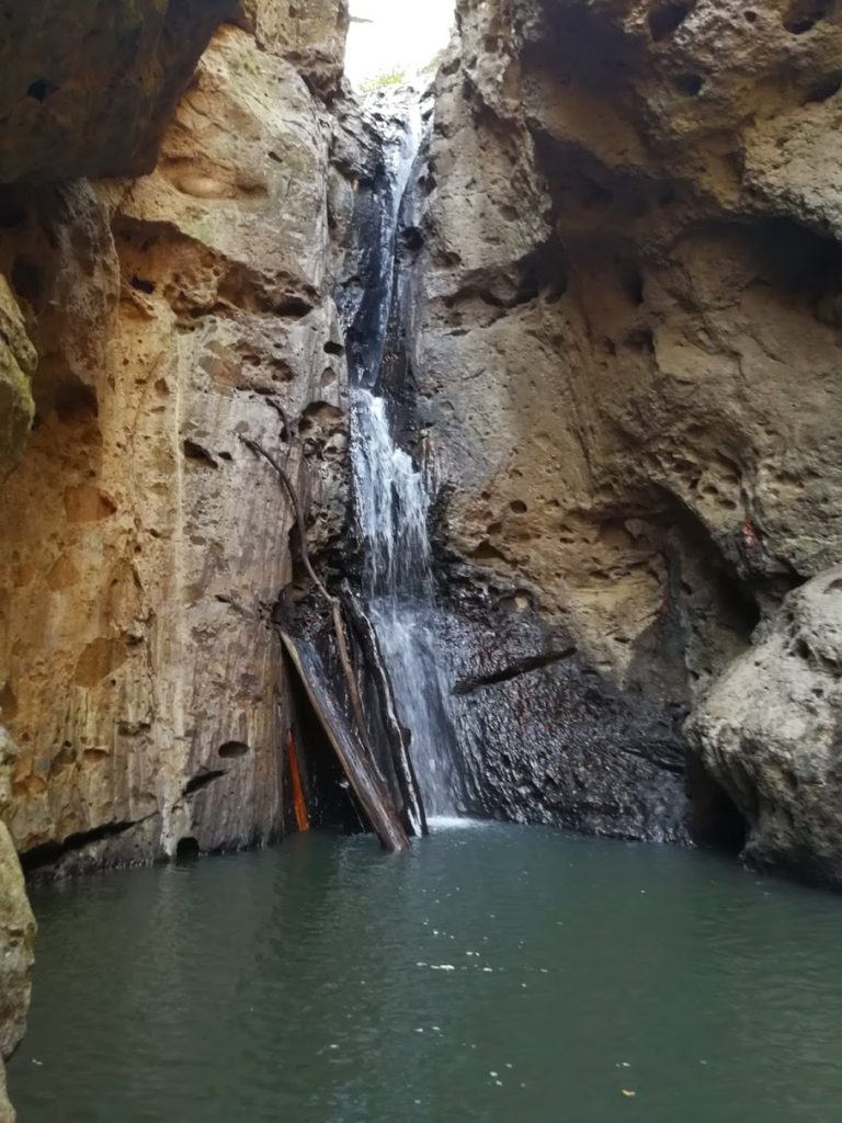 Para ver melhor a cascata, é preciso molhar as pernas (a água chega até as coxas). A água é gelada, o que não faz ninguém querer tomar banho.