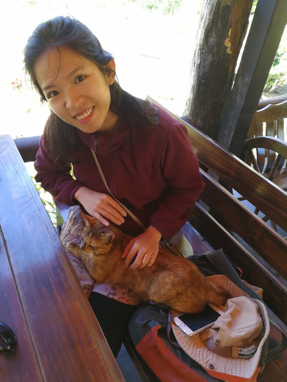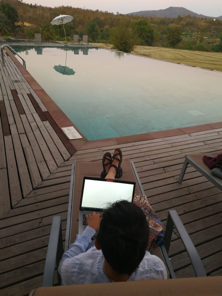 Temos de trabalhar o dia todo. Não querendo ficar no quarto o dia todo, trabalhamos no restaurante do hotel, um lugar aberto com vista para a piscina. Estamos rodeados de gatos, não sei se são gatos selvagens ou se são alimentados pelo hotel. Em todo o caso, são muito fofinhos, estão sempre a ronronar, faz-me sentir bem!