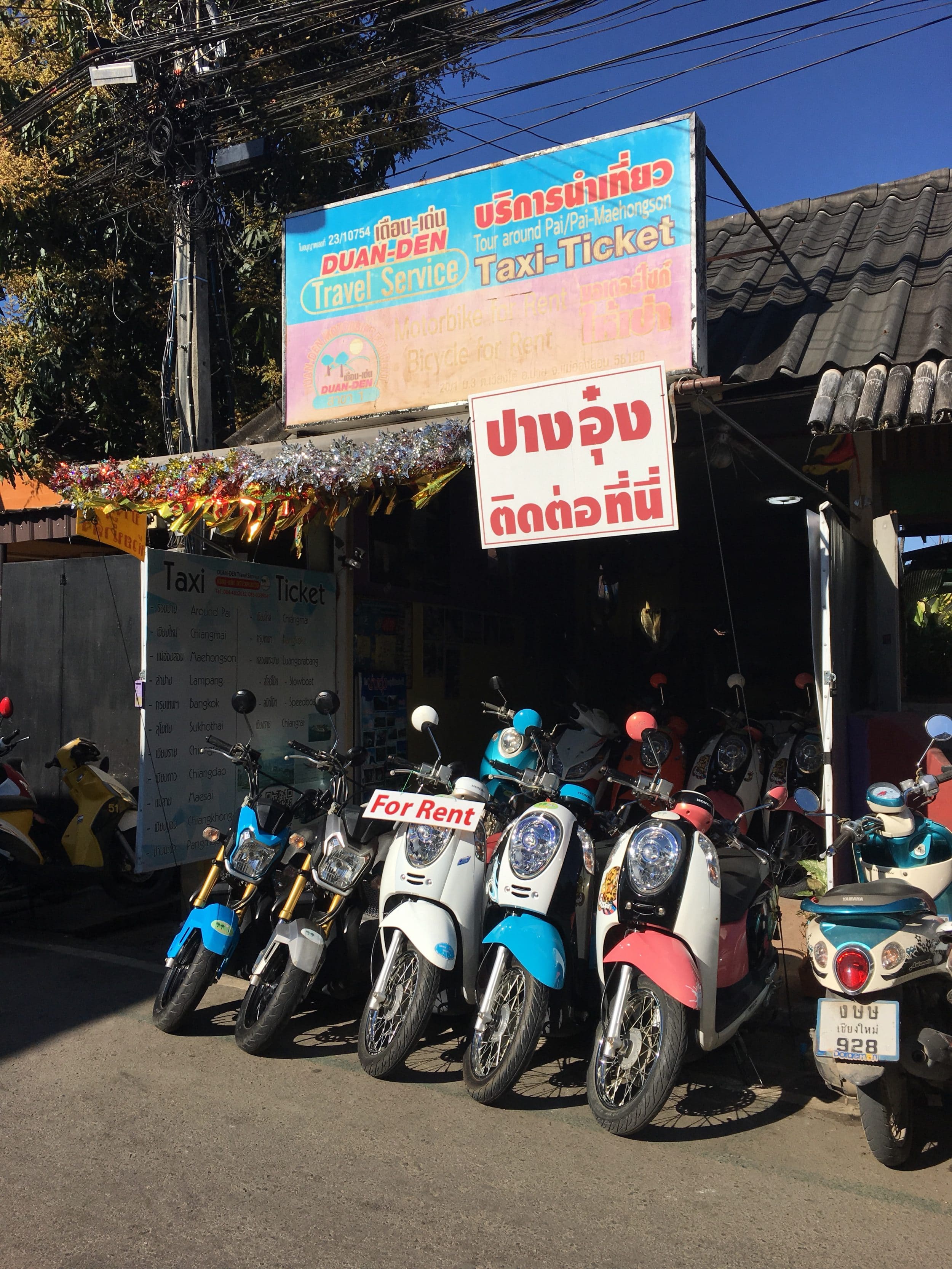 - Aluguer de Scooters: a partir de 100 baht/dia. Há muitos alugueres de motos no centro de Pai. Até há motos eléctricas se não se for bom com uma motocicleta.