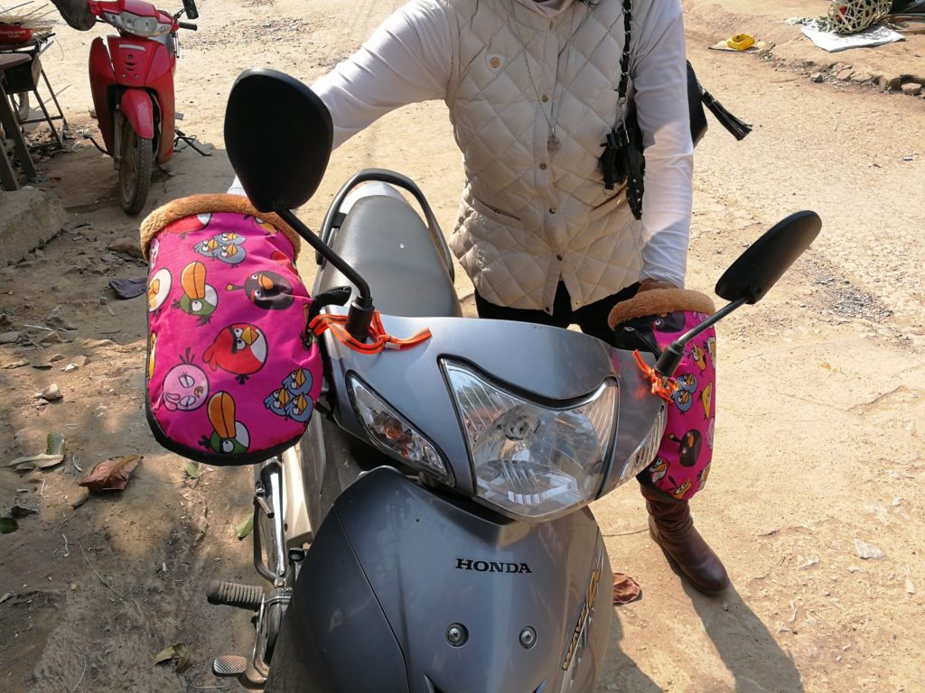 Aqui, os motoqueiros “mexem” nas luvas de cozinha para que os dedos não congelem quando conduzem