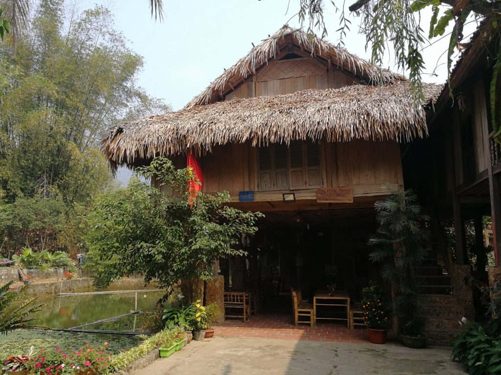 Caminhamos um pouco e descobrimos outra homestay. Esta casa de família, encostada à montanha, tem 2 bungalows e 2 quartos magníficos oferecendo uma vista impressionante sobre o vale (quarto duplo a 500000VND/noite). Como eles estão servindo comida para os 4 turistas franceses, perguntamos a eles se ainda têm algo para nós. No início dizem que não, e depois, como insistimos, aceitam servir-nos alguns legumes e carne