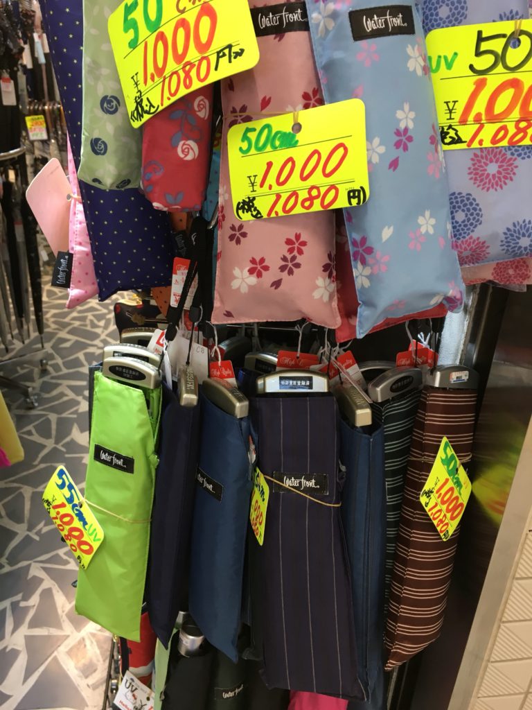 Também há guarda-chuvas japoneses. Minha mãe (que já esteve no Japão) me disse que eu definitivamente deveria comprar um. O pulso dos guarda-chuvas japoneses é rectangular, por isso são muito mais finos e peso-pluma contra os guarda-chuvas vendidos em França com pulsos redondos. E custa apenas 1000yens (7,7 euros)