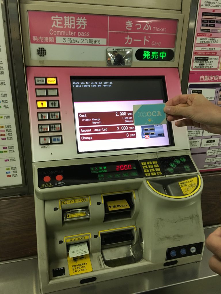 - Compra de um cartão ICOCA: 2.000 ienes, incluindo 500 ienes de depósito, e 1.500 ienes de crédito a ser utilizado para as máquinas de metrô/bebidas