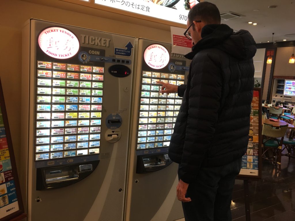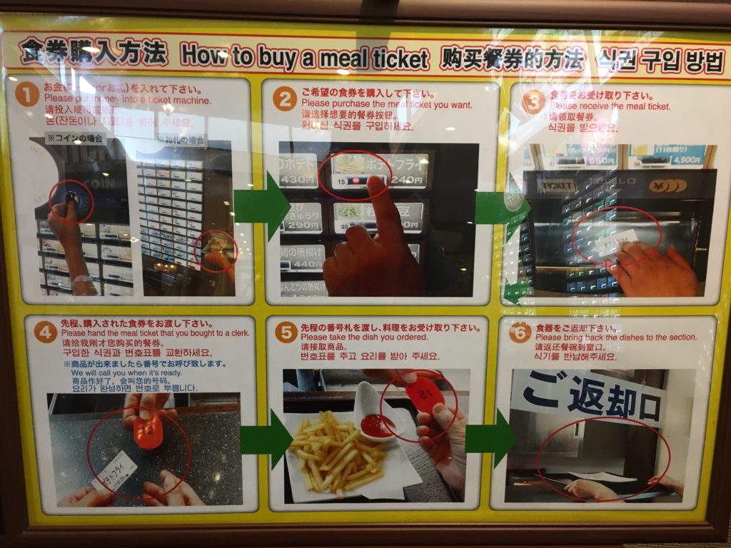 Nós escolhemos os nossos pratos com o toque de um botão, nós pagamos. E depois damos os bilhetes à empregada de mesa. Depois ela dá-nos um número. E quando a encomenda estiver pronta, ela vai ligar para o nosso número. Toda a comunicação com a assistente de vendas é em japonês, mas dado o contexto, você pode entender tudo o que ela diz:D