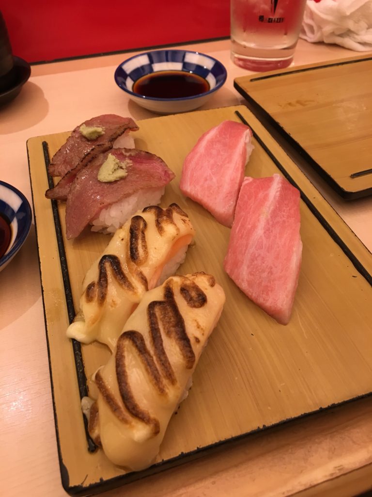 Aqui pedimos sushi por sushi. Há números em frente de cada tipo de sushi/maki. Tem de escrever o seu pedido num pedaço de papel e entregá-lo ao empregado/chefe. O sushi custa entre 100yen e 300yen por peça. Como somos gananciosos, escolhemos os sushis mais caros, que são mais fornecidos em peixe (atum gordo, salmão gordo, atum muito gordo…)