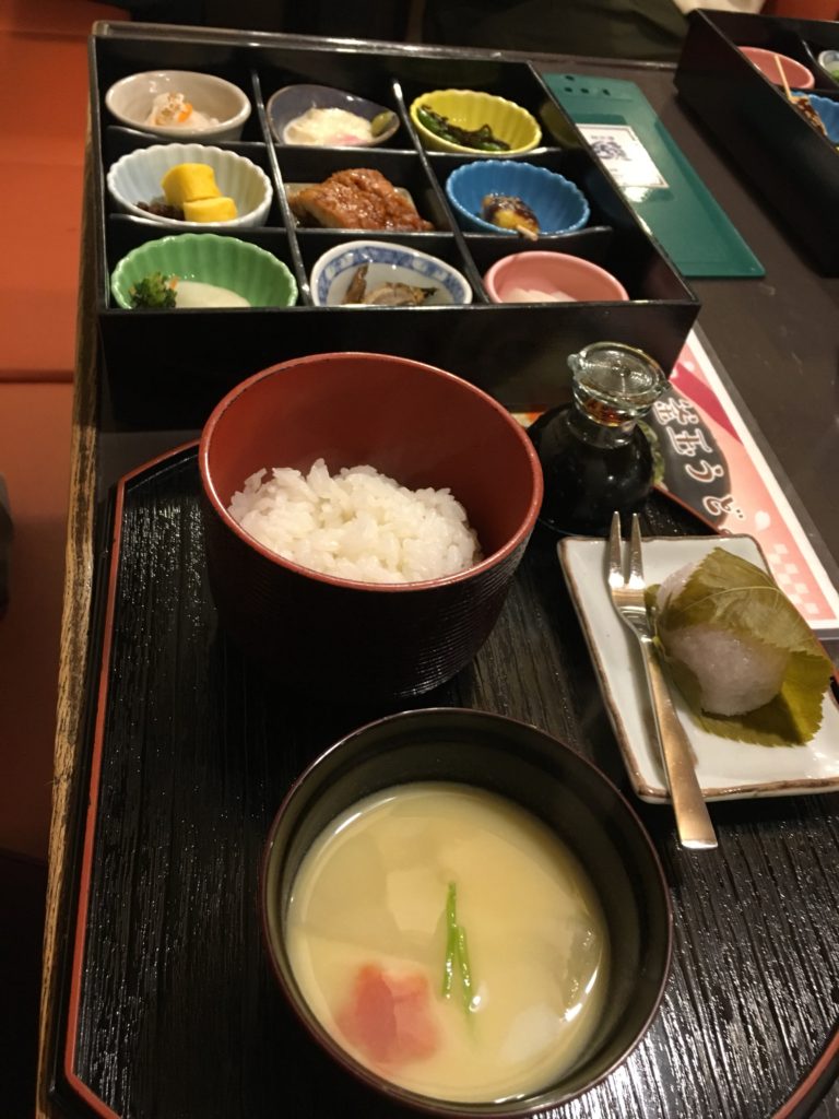 Na minha opinião, deve ser mais autêntico do que qualquer coisa que tenhamos servido até agora… porque não gostamos muito 😀 Bem, estas não são coisas que estamos habituados a comer, especialmente Yuba (película fina que se forma quando fervemos leite de soja), quando comemos sozinho não é muito bom mas com molho de soja é delicioso (para mim de qualquer maneira, JB odeia). Também temos uma sopa que parece sopa de miso, mas não é. E surpresa: lá dentro há um bolo de arroz pegajoso