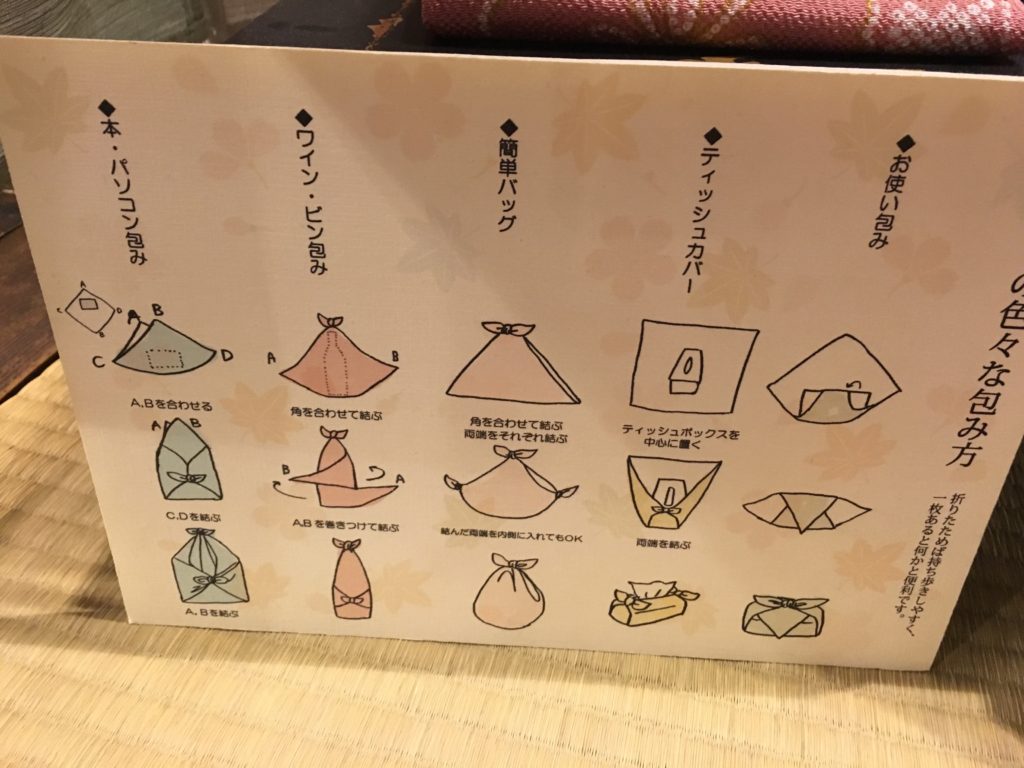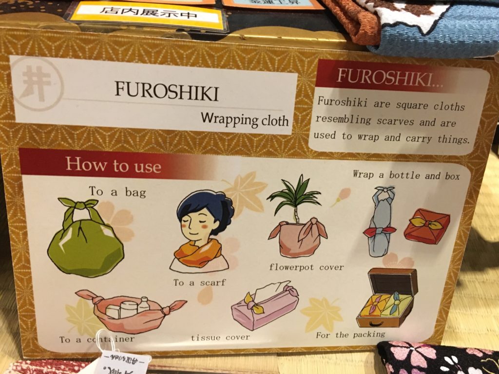 Todos eles vendem grandes tecidos quadrados chamados Furoshiki que são usados para embrulhar coisas: um bento, uma garrafa… ou para ser usado como um lenço