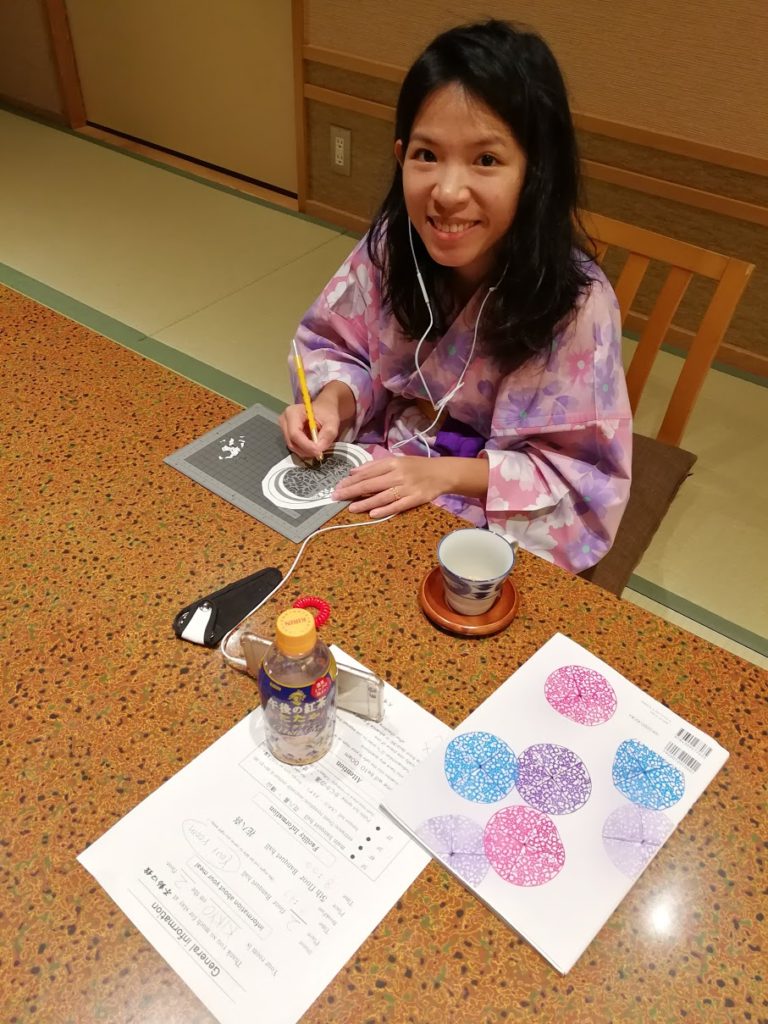 Em modo relaxante, voltamos para o quarto enquanto esperamos pelo jantar que será servido no quarto. A anfitriã na recepção perguntou-nos a que horas queríamos jantar ainda por cima. Entretanto, estou a fazer uma actividade que se adequa ao ambiente em que estou: o corte de papel. Escrevi aquium grande panfleto sobre a arte de cortar papel japonês.
