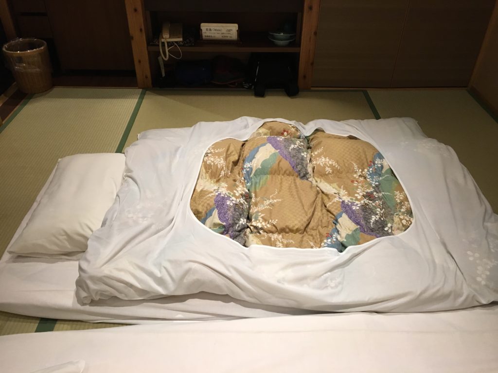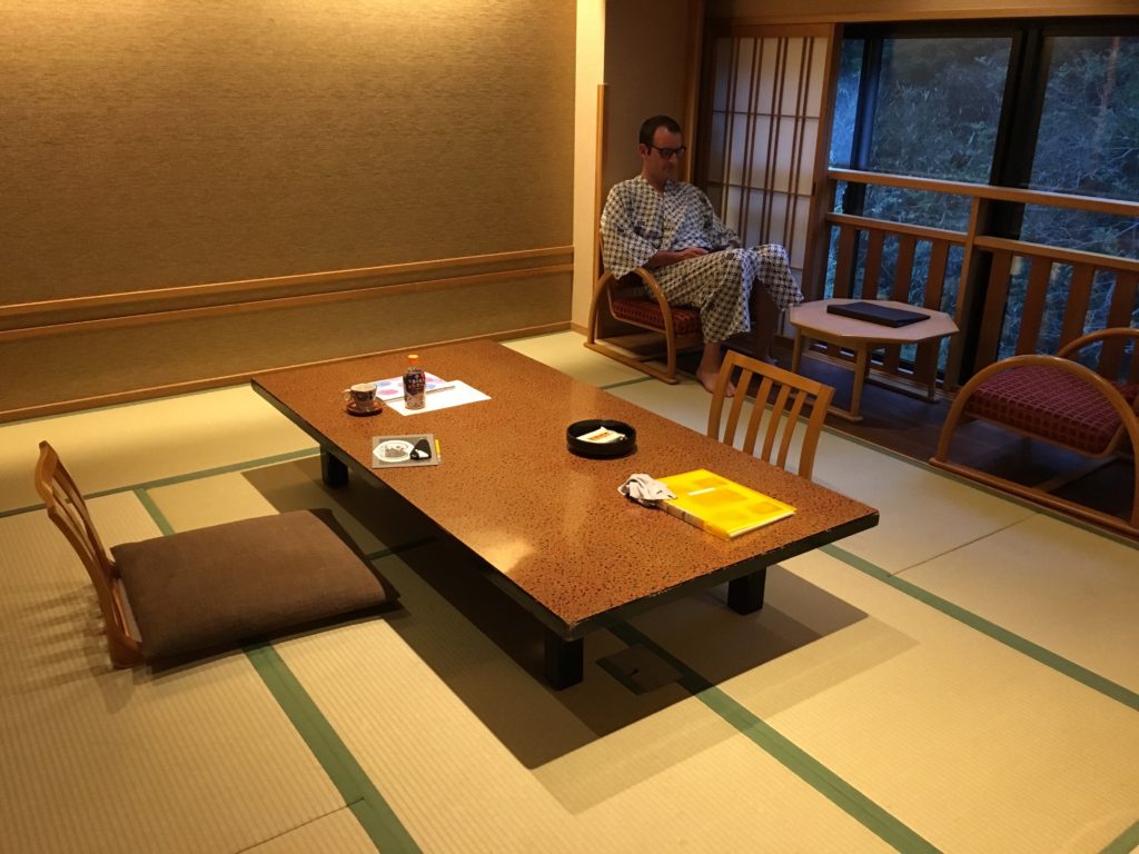 O ryokan é uma pousada tradicional japonesa. No passado, era mais frequentada pela aristocracia, mas hoje em dia, os ryokans podem ser comparados a spas com alojamento. Alguns ryokans têm onsens dentro, outros não. Mas o que eles têm em comum é a sua excelente localização/ambiente (muitas vezes no deserto), serviço impecável (com jantar normalmente servido na sala). Escolhemos um ryokan com onsen.