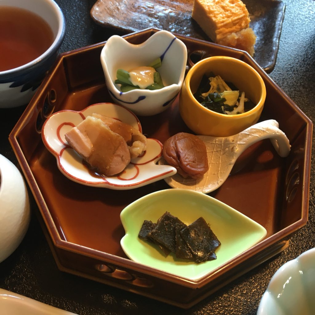 O pequeno-almoço está incluído mas não é servido no quarto. Deixamos o yukata e usamos roupas normais para descer para o café da manhã. Assim que entramos na sala de jantar, todos ficam em silêncio, devem ficar surpresos ao ver um homem branco no ryokan, e certamente curiosos para ver se gostamos ou não da comida japonesa.