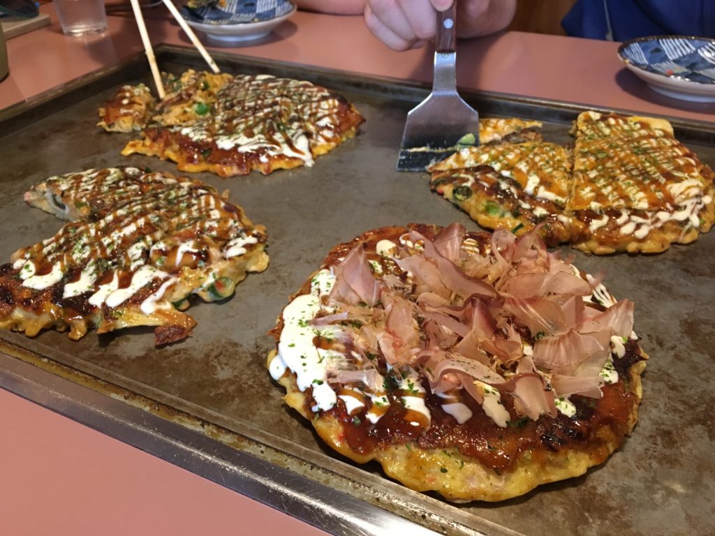 Nós nos encontramos em frente a um restaurante okonomiyaki, apelidado de “pizza japonesa”, mas com muita maionese e molho para churrasco. Nossa primeira tentativa em Osaka foi um fracasso total, então mal podemos esperar para experimentar este novo restaurante, esperando que ele seja melhor