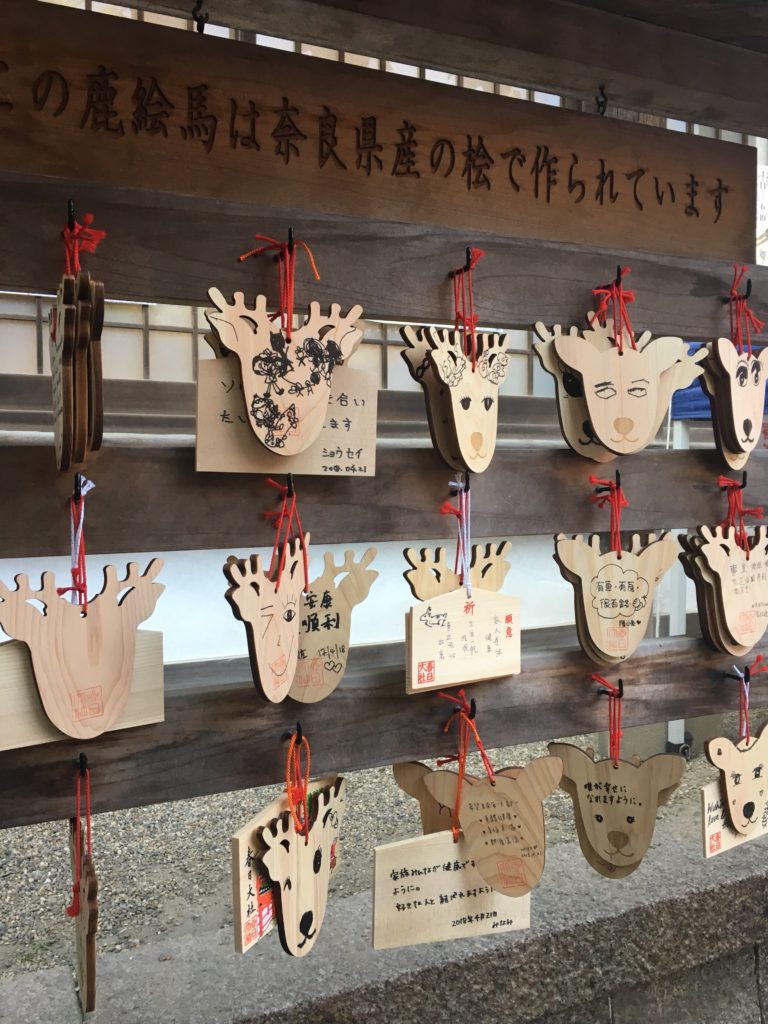 Você pode comprar uma espécie de porta desejos pendurado por 500 ienes, tem a forma de uma cabeça de veado, e você tem que desenhar os olhos, etc. É divertido