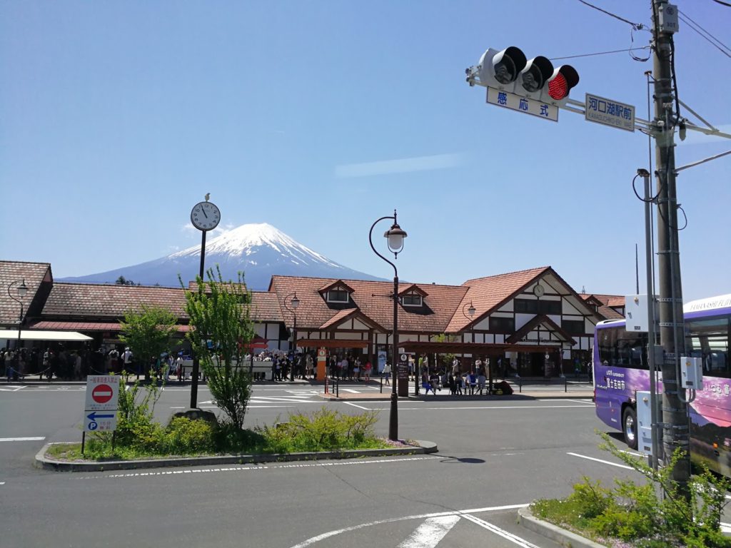 O nosso autocarro parte às 7:30 da manhã, mas só chegamos às 11 da manhã à estação de Kawaguchiko (em vez das 9:30) porque estamos no meio da Semana Dourada (o equivalente às pontes de Maio em França, há 3 feriados na semana) e o tráfego é horrível. O Monte Fuji fica mesmo atrás da estação. Nós temos sorte! Apenas uma pequena nuvem que em breve irá desaparecer