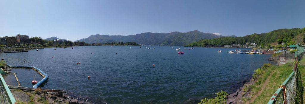 E depois atravessamos uma ponte, que nos dá uma bela vista da montanha, e voltamos pelo outro lado do lago, depois de passarmos um tempo num onsen que não recomendamos