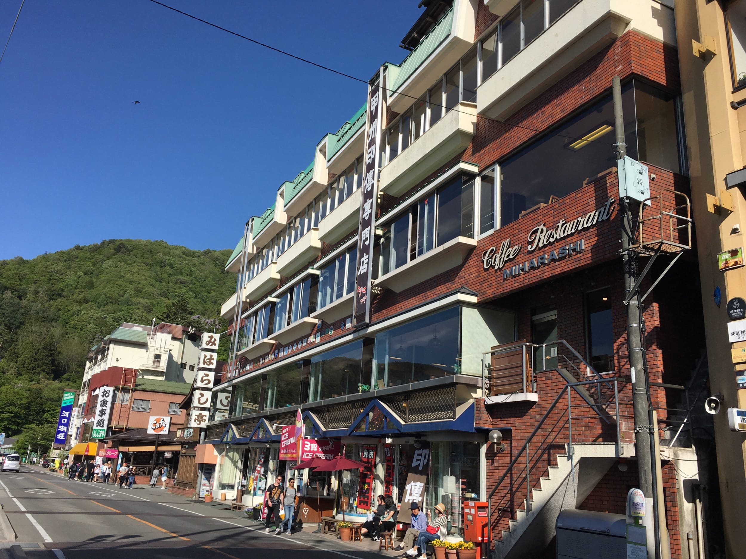 Nós vamos pelo banco. No início, não vemos mais o Monte Fuji, que está escondido por uma grande montanha (há um teleférico que leva ao topo desta montanha)… e então começamos a ver os hotéis de 5 estrelas, e os ryokans… e finalmente, o Monte Fuji reaparece, mais bonito do que nunca