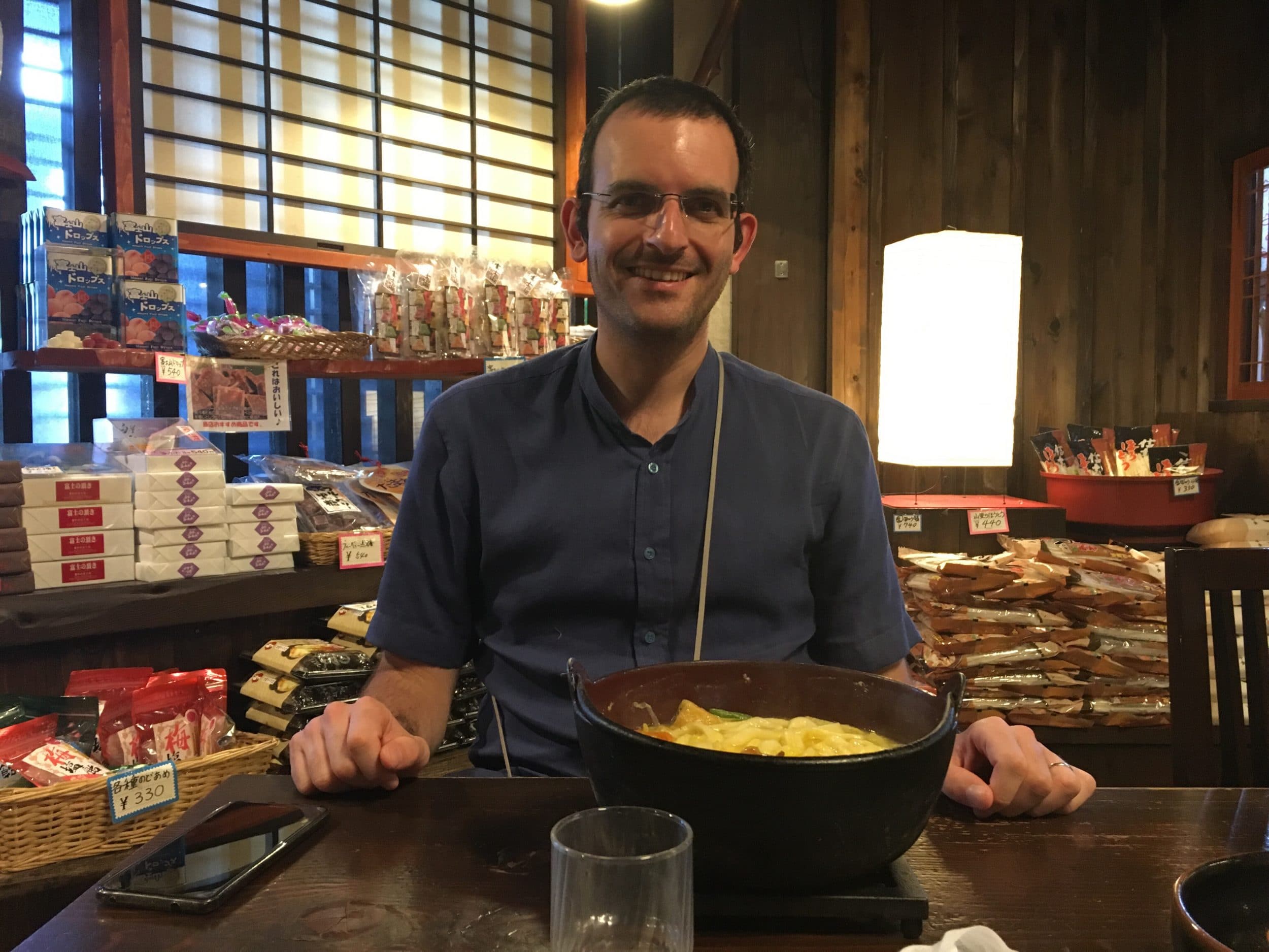 Deixa pra lá! Estamos à espera na fila de um restaurante em frente à estação. Apesar do mundo, está indo bem rápido, e pedimos a especialidade do restaurante, uma enorme tigela de macarrão. Ainda bem que estamos com fome. Eu até consegui terminar 2/3 da taça e JB 3/4 da taça! E ficaremos muito felizes por termos comido tanto porque também vamos levar 4h30 para voltarmos a Tóquio, sem saber