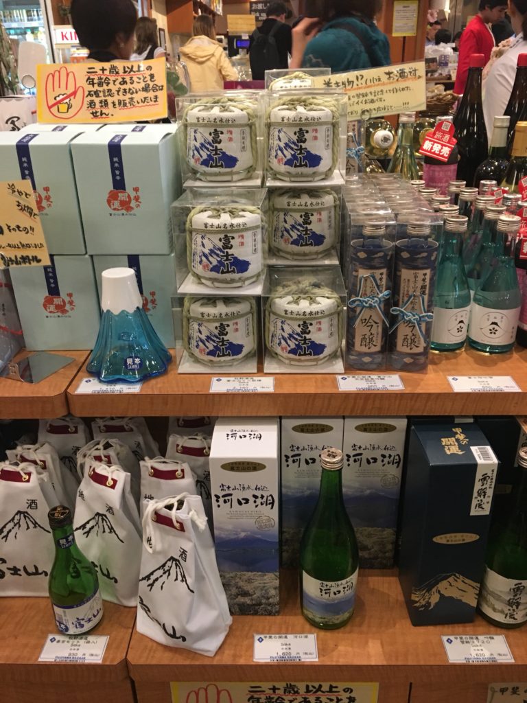 Dê uma olhada na loja de lembranças, há muitas coisas legais como este vidro com a forma do Monte Fuji e mini barris de saquê