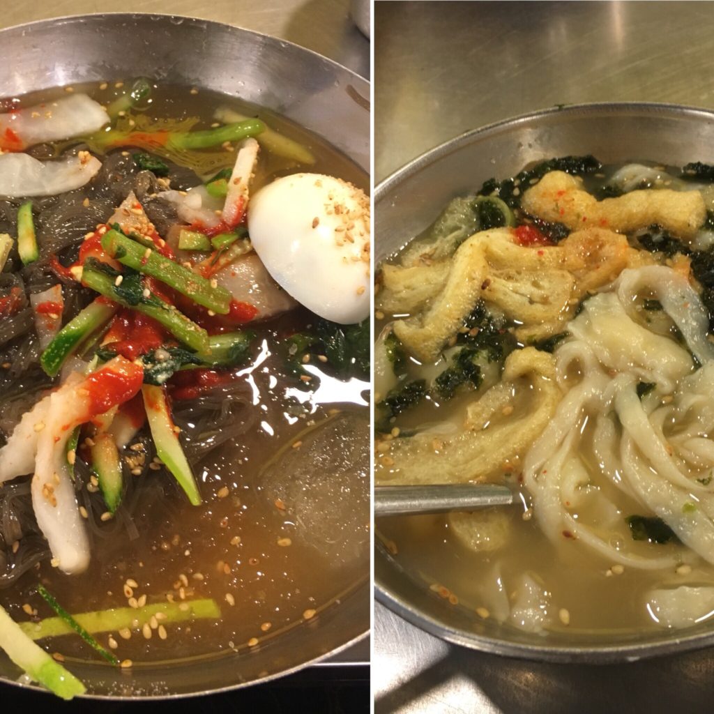 JB imediatamente avista uma pequena viela onde todas as vendedoras vendem bibimbap e macarrão frio. Apesar da minha insistência na importância de um prato não picante, ela ainda coloca uma colher cheia de pimenta malagueta dentro dele 🙁