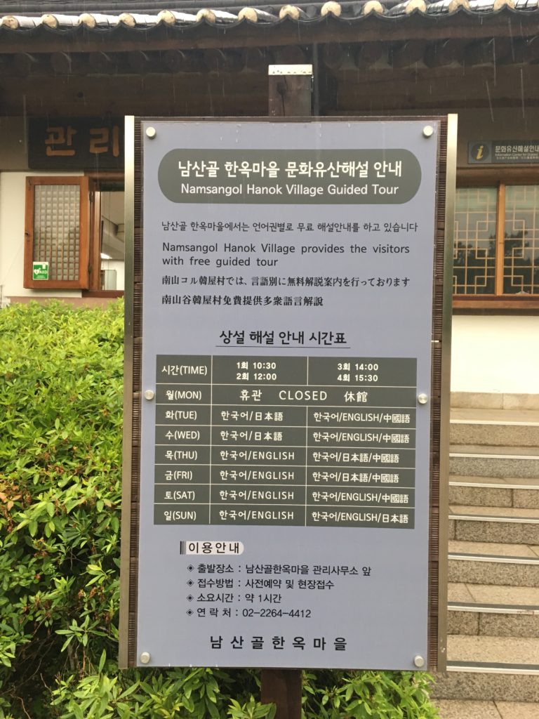 Depois vamos a Namsangol Hanok Village, uma estação longe… e descobrimos que também há visitas guiadas gratuitas. Provavelmente voltaremos noutro dia
