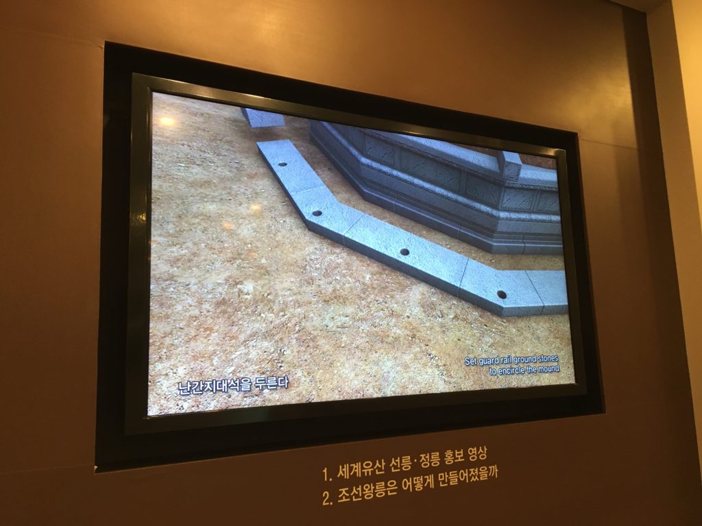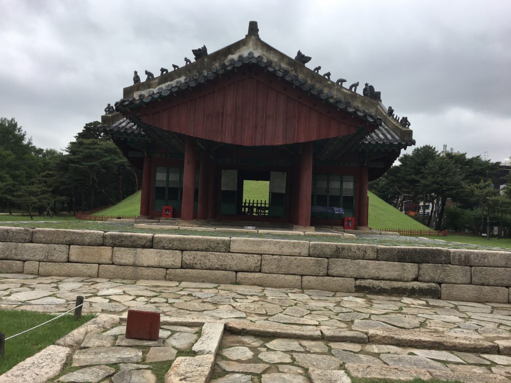 Como o túmulo do Rei Jeongneung está mais perto da bilheteira, nós visitamo-lo primeiro. A sua tumba está localizada na colina atrás deste edifício de madeira que só é usado para realizar rituais