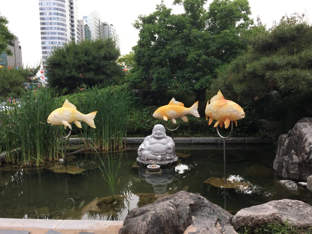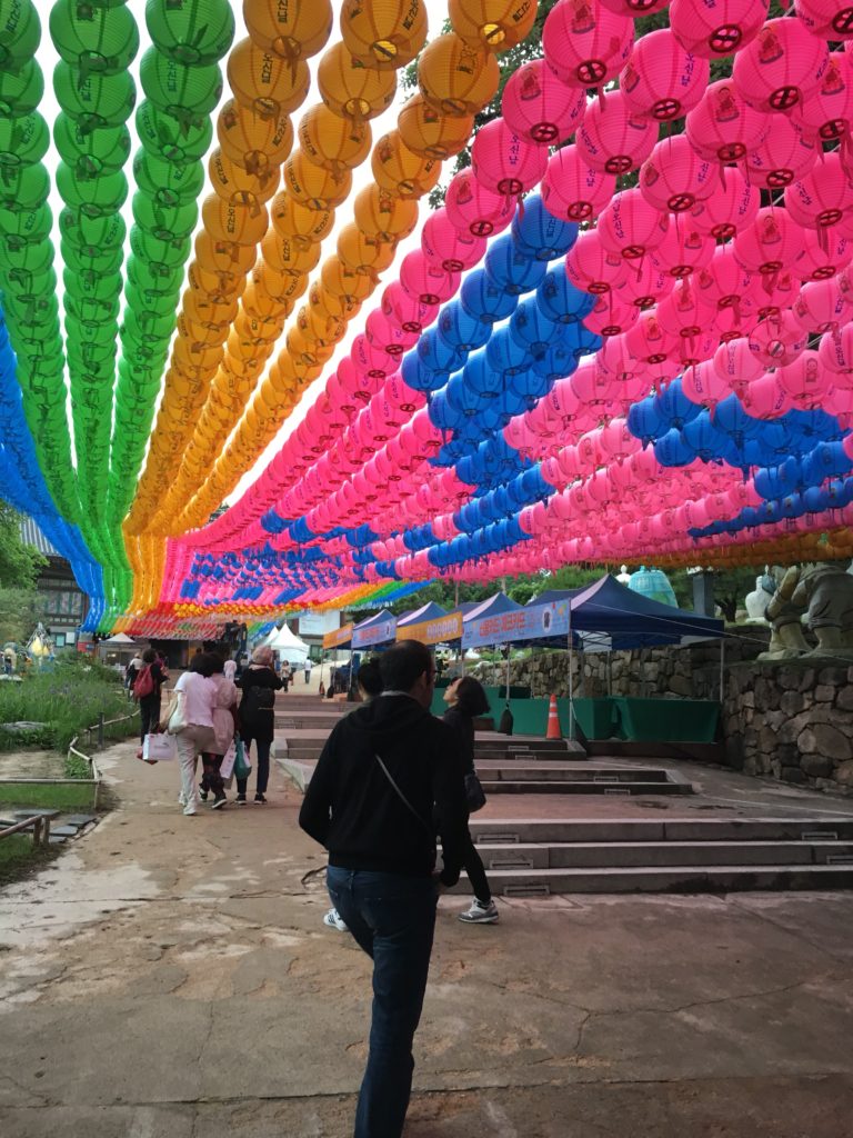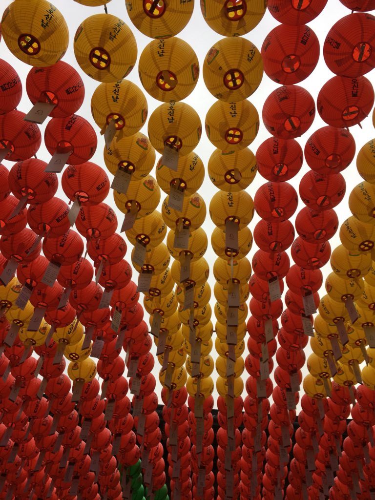 Finalmente chegamos ao Templo Bongeunsa, aberto 24 horas por dia. O aniversário de Buda já passou, mas as lanternas feitas para a ocasião ainda estão lá