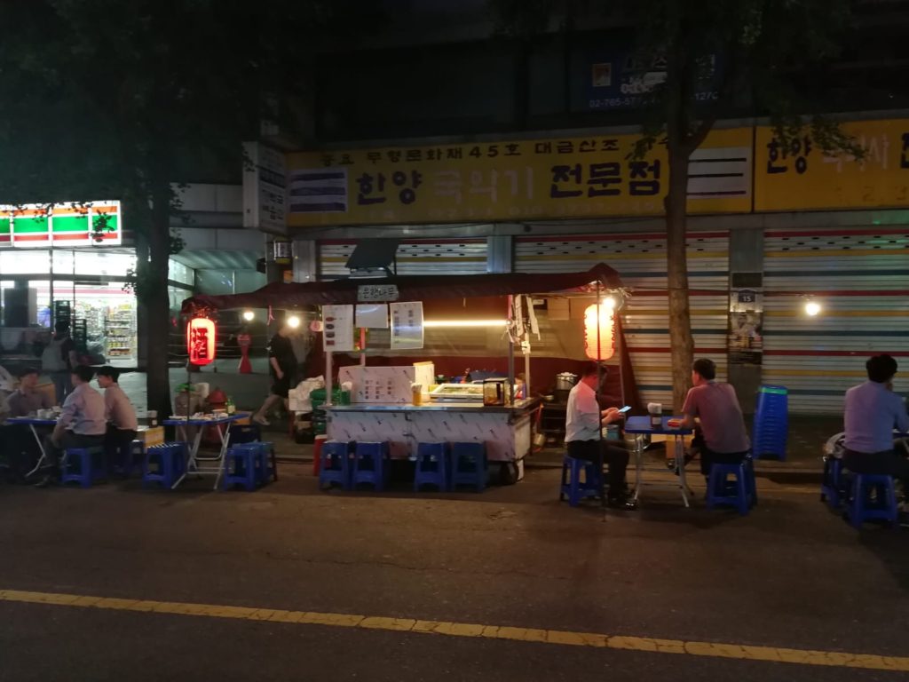 Depois deste prato muito bom mas muito calórico e energético (o ginseng revitaliza e ajuda a sentir-se energético, e o frango com ginseng é um excelente prato para os doentes), caminhamos durante muito tempo nas vielas de Seul. E depois, encontramos estes famosos bui bui instalados na rua (metade na rua, metade na calçada). Ohhhh aqueles famosos bui bui bui que se vêem nos dramas coreanos. Cada vez que um personagem é abandonado, ele inevitavelmente acaba bêbado em um bui bui como este (para experimentar estes bui bui, vá para a estação Jongno3(sam)-ga Line 5à noite)