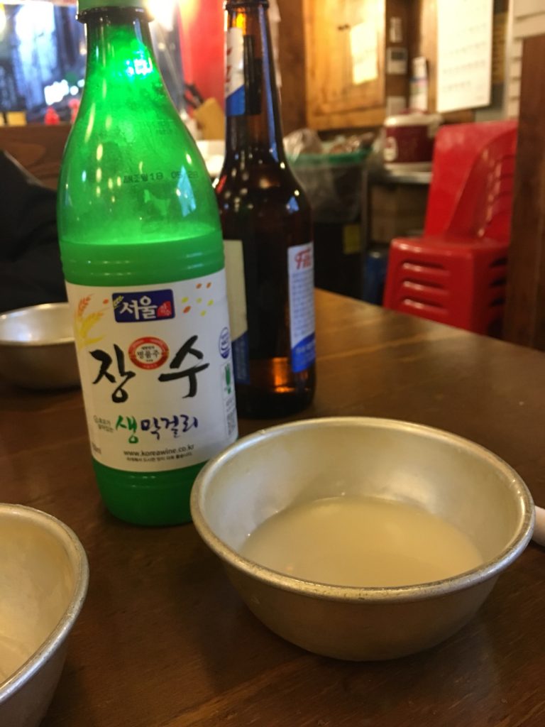 Mas somos muito sábios, pedindo apenas uma garrafa de álcool de arroz (não soju), servido em pequenas tigelas de metal