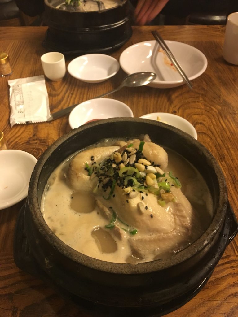 M. tem uma checklist de restaurantes para ir enquanto estiver na Coreia e estamos felizes em fazer a checklist com ela. Em primeiro lugar, temos de ir àquele famoso restaurante de sopa de frango ginseng (tipo Local Food ginseng chicken soup on Naver). Aqui, as reservas são aceites para um mínimo de 10 pessoas. Para menos de 10 pessoas, só tens de esperar na fila. O restaurante está em um hanok (casa tradicional coreana), então você pode dizer que a decoração é de cima, há até um lugar onde você pode sentar no chão (mas dói um pouco as suas costas)