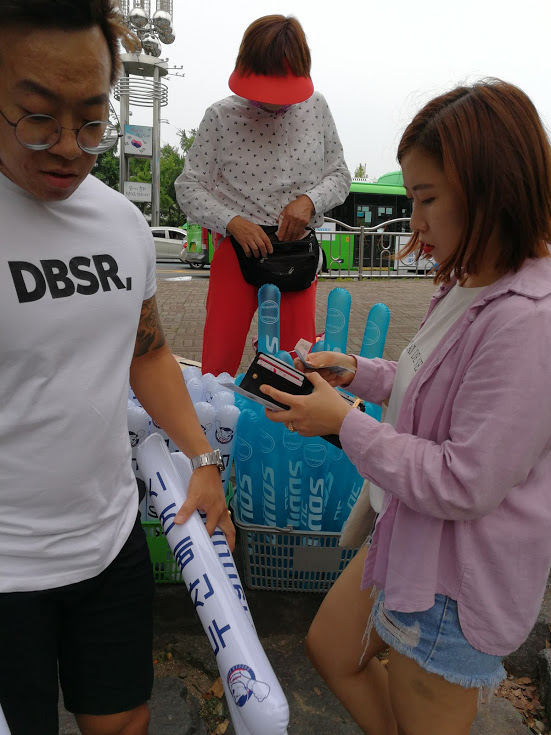 Para poder participar, compro “chips de plástico” (2000 won) para poder fazer barulho e participar da atmosfera