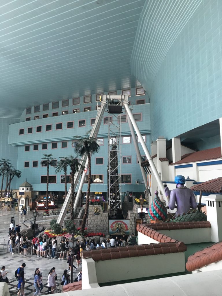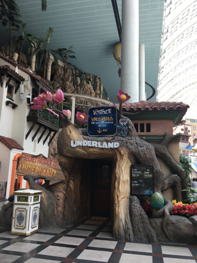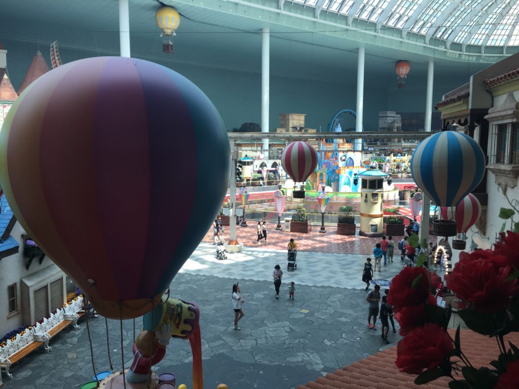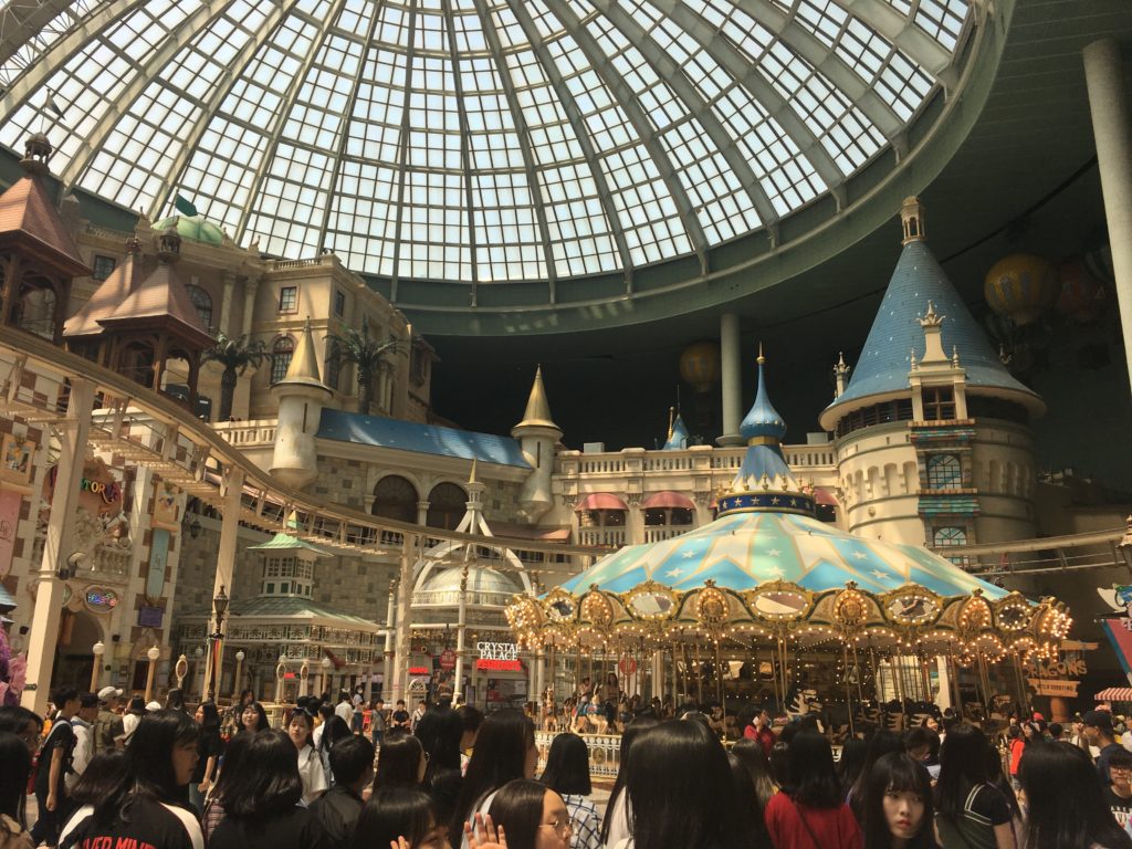 O parque está localizado no coração do centro comercial Lotte. Lotte é um enorme grupo coreano, que tem muitos centros comerciais, uma cadeia de fast food Lotteria… e estão até em expansão no sudeste asiático. Então o parque de diversões também tem ar falso no centro comercial