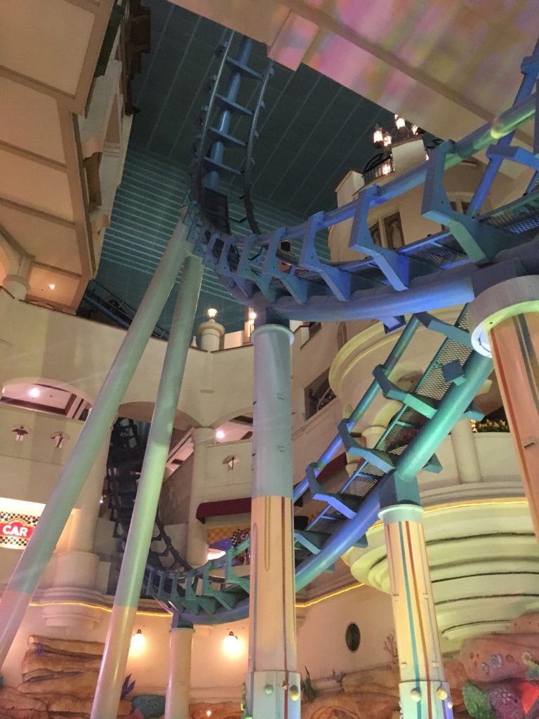 É hora de sair deste “shopping” e explorar a parte de conto de fadas do parque, ou seja, a Ilha da Magia. Não há nada no castelo, eu aviso-te. Mas ao lado dela, você pode ver a torre GyroDrop 2 VR