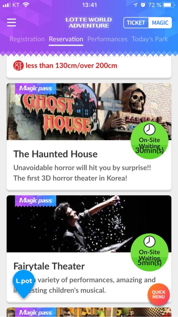 Esqueci-me de te falar do sistema Magic Pass, o equivalente ao Passe Rápido da Disneylândia. Há várias máquinas onde você pode solicitar um Magic Pass: ou uma máquina central no nível 1F, ou a máquina na frente de cada atração. Na época em que visitamos a Lotte World, todas as máquinas em frente às atrações estavam fora de ordem. Então tivemos que baixar o aplicativo Lotte World e reservar os passes mágicos diretamente em nosso telefone (depois de escanear nossos ingressos)